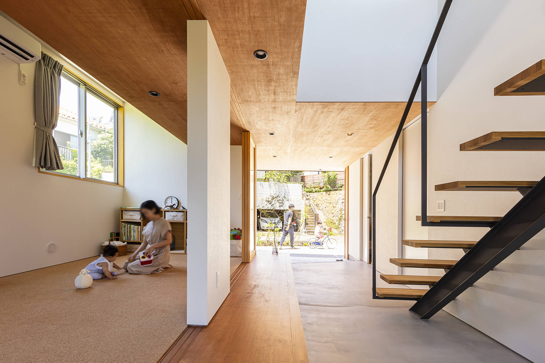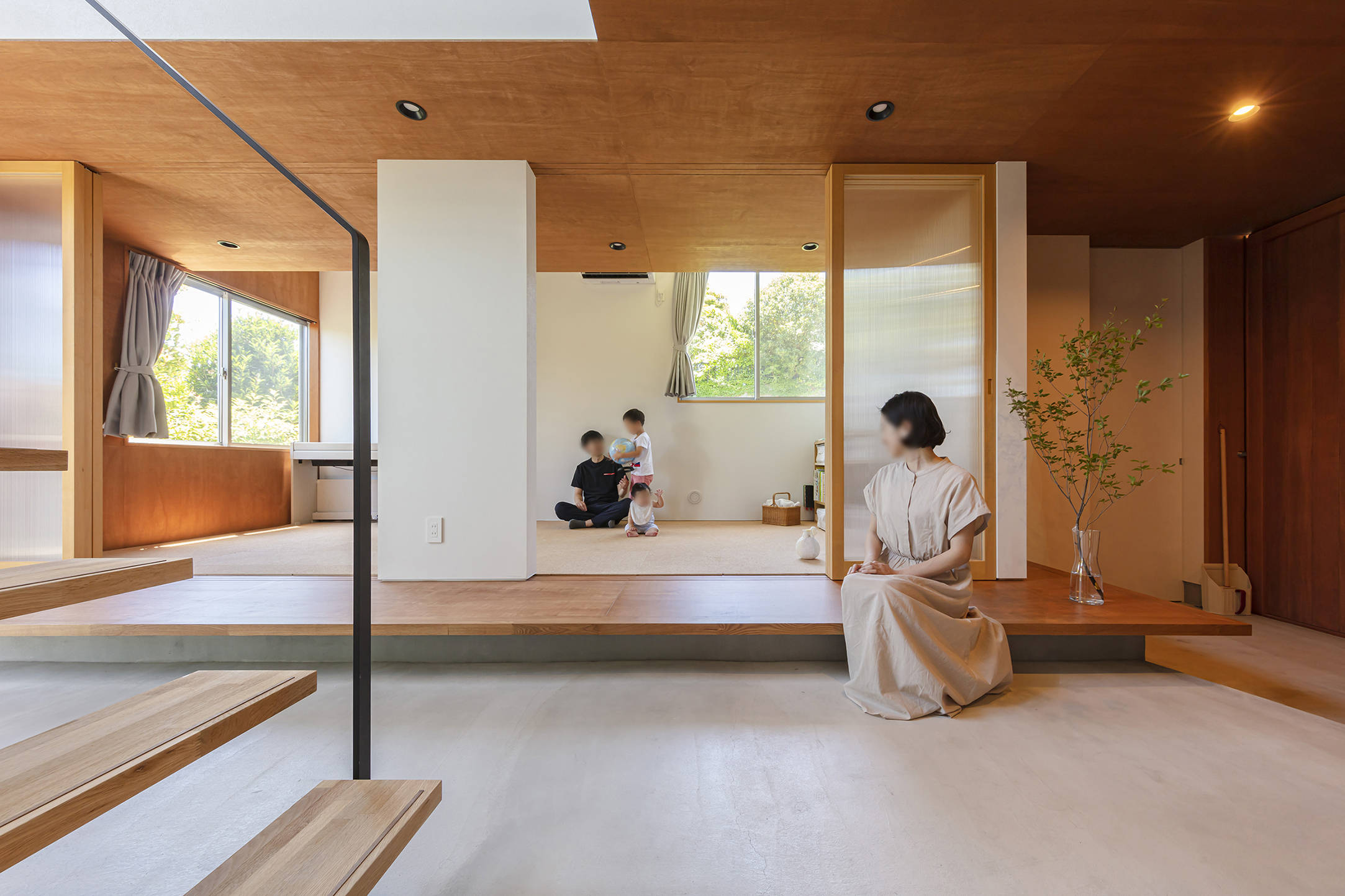 道路に面する北側は近隣にも開かれたパブリックな前庭、既存の樹木が残る南側は家族のためのプライベートな庭として位置付けました。この2つの庭をつなぐように屋内中央に土間を通し、ここに200mmレベルを上げた内縁を設えることで、見知った来客を迎えられるかつての民家の縁側のようなセミパブリックな性質を持たせています。