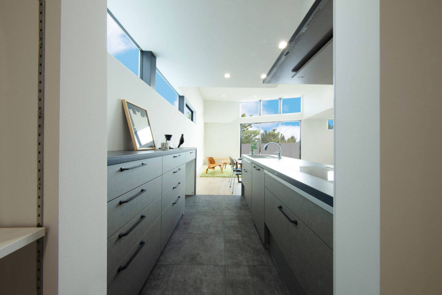 空間どうしが心地よくつながることで、家のどこにいてもスムーズに移動できます。そのため、毎日の家事や生活も快適に、効率よくこなせます。例えば、玄関からパントリー、キッチンへと直結している設計により、食料品などの買い物後、そのままパントリーへ手間なく収納できる便利さが生まれます。