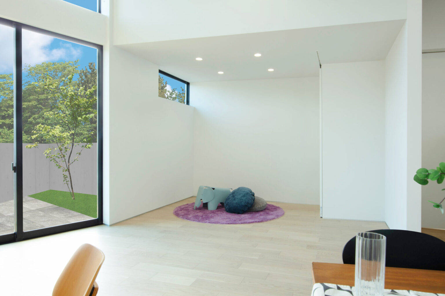 「傾聴の家」は、「中間壁」を採用することで、個々の空間が壁によって遮断されず、空間どうしが繋がり合い、奥行きが生まれます。そのため、家のどこにいても家族の気配を感じられることができます。また、「傾聴の家」は回遊性のある間取りとなっています。