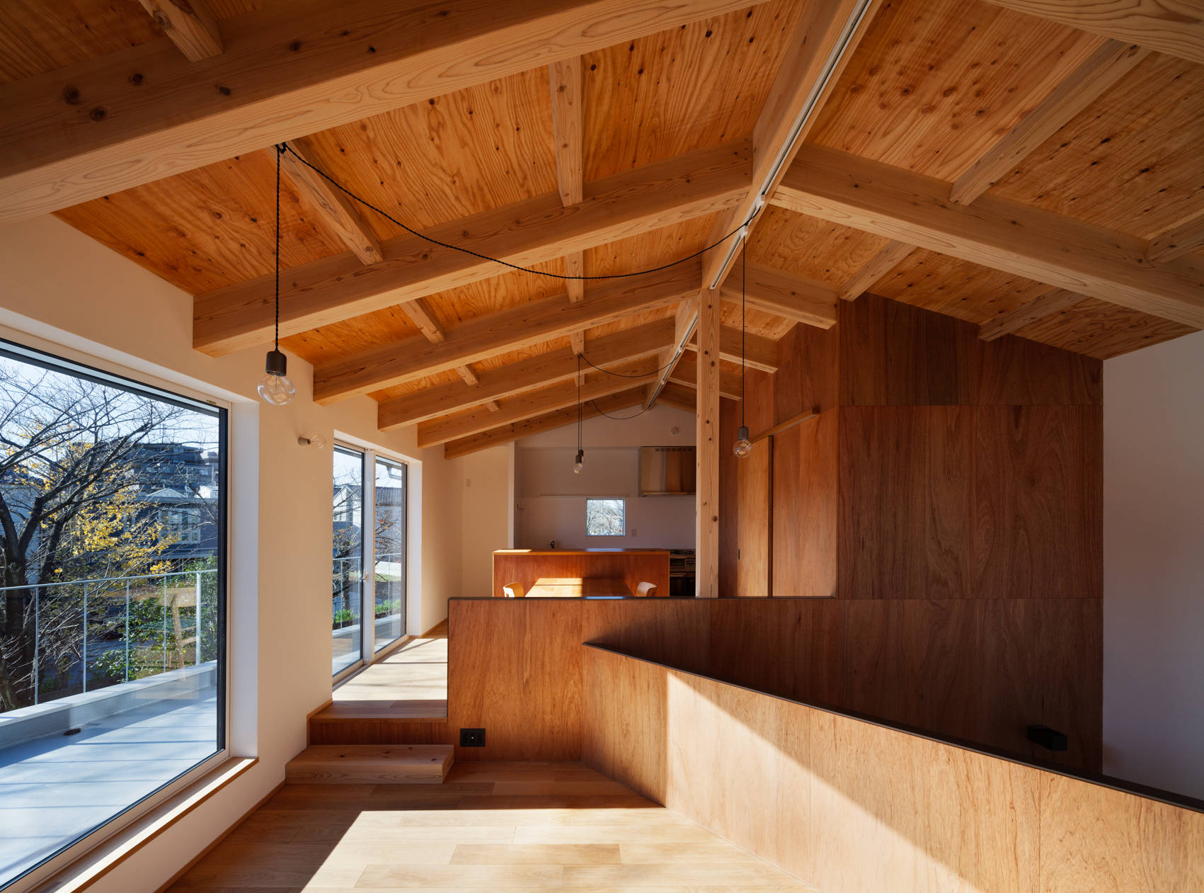 屋内外の木材の架構は、杉製材のあらわしとしつつ、室内仕上げは、無垢フローリング、珪藻土、ラワン合板、シナ合板、コンクリートなど、素材(素の材料)のまま生かすことにより、木造らしさ・素材の持つやわらかさを表現しています。