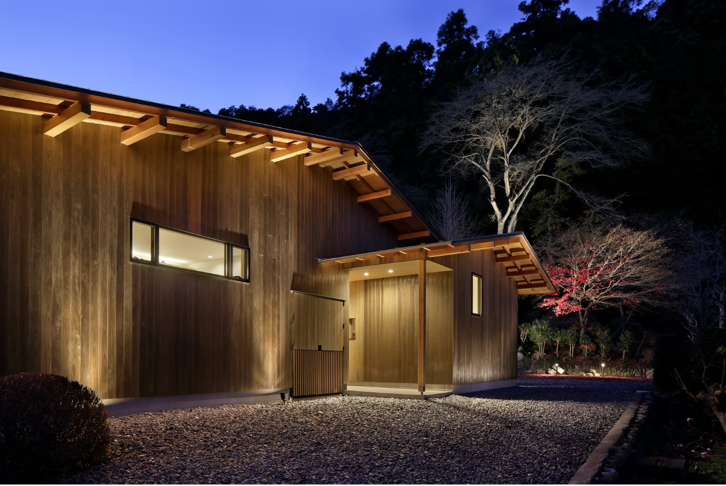 屋根は平面形状に合わせて切妻を切り替え、場所に応じて異なる棟の高さが山の連なりのように見える。外壁の杉板と相まって馴染みながら、周辺環境と暮らしに根差す建築となった。