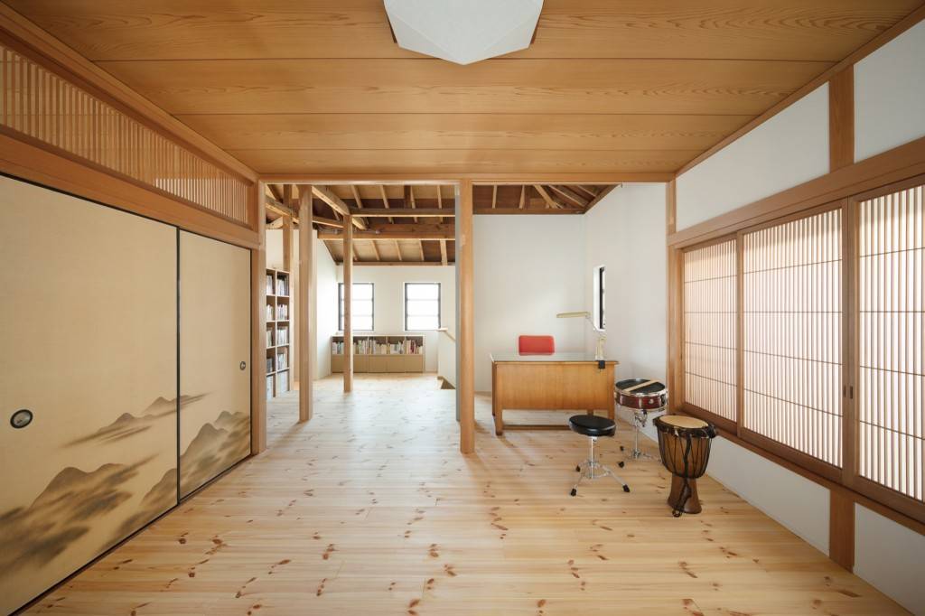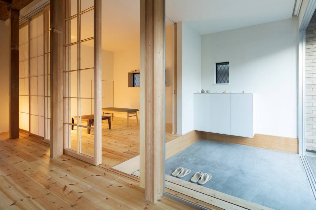 この家には家開きの用意として、浴室とは別にシャワー室を設け、リビングを宿泊室として使えるような障子建具も設えています。