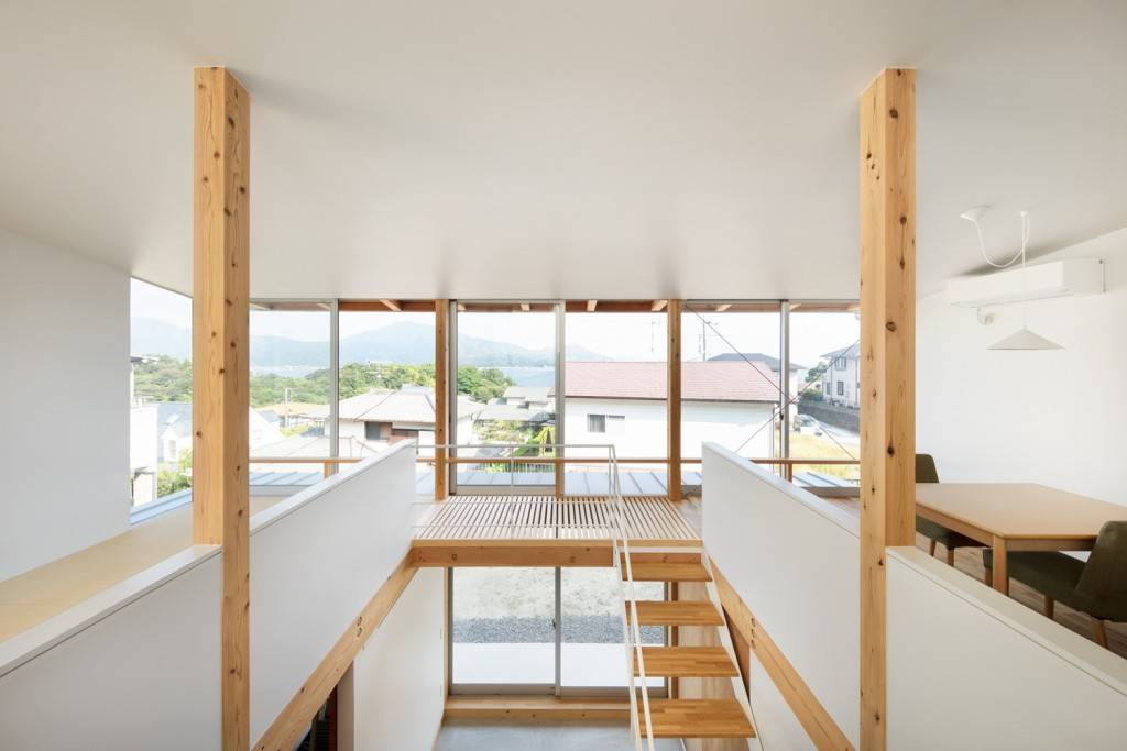 南北にも東西にもひな壇上になっている宅地の中で、この家は周囲とは少し違った角度の配置となります。隣家とは正面に向かい合わず、斜面地を自然と見下ろすように厳島へと視線が向けられます。道路からは、家の周囲にできた庭へと視線が抜け、その先の海の存在を道往くひとに知らせます。
