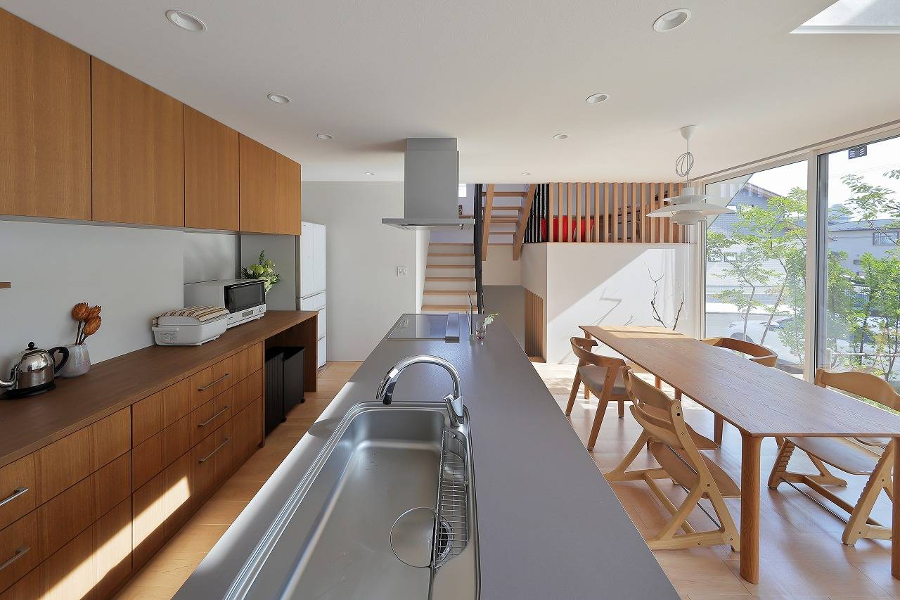 玄関からLDK へのアクセスや、階段を通じて二階のライブラリーやそれぞれの居室へ空間がシームレスに繋がっており、回遊動線で繋がれたそれぞれの居場所は、互いを感じながらそれぞれの居場所を楽しむことができます。