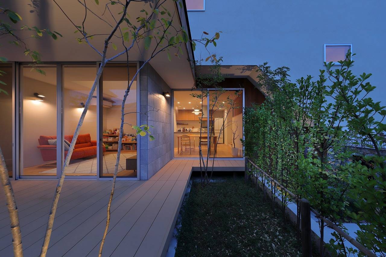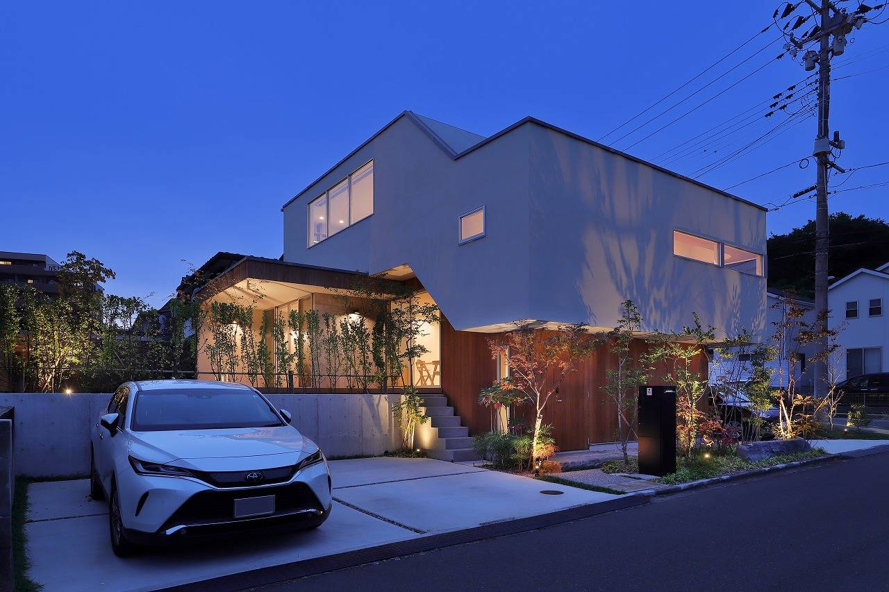 高低差のある敷地に建物のヴォリュームを組み立てることで、地形を生かしたアプローチと庭を作り出し、周囲の自然環境と調和する住まいが出来上がりました。