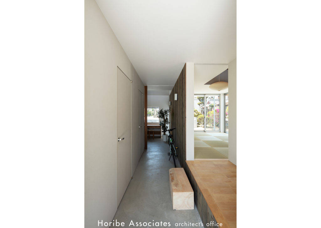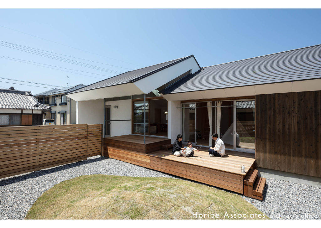 敷地は古い日本家屋の多く残る神社への参道沿い。新しい住まいは母屋との関係と街並みとの調和を考え、3分割したボリュームを雁行して配置し、切妻の立面が3つ連なる平屋建ての住まいとしました。