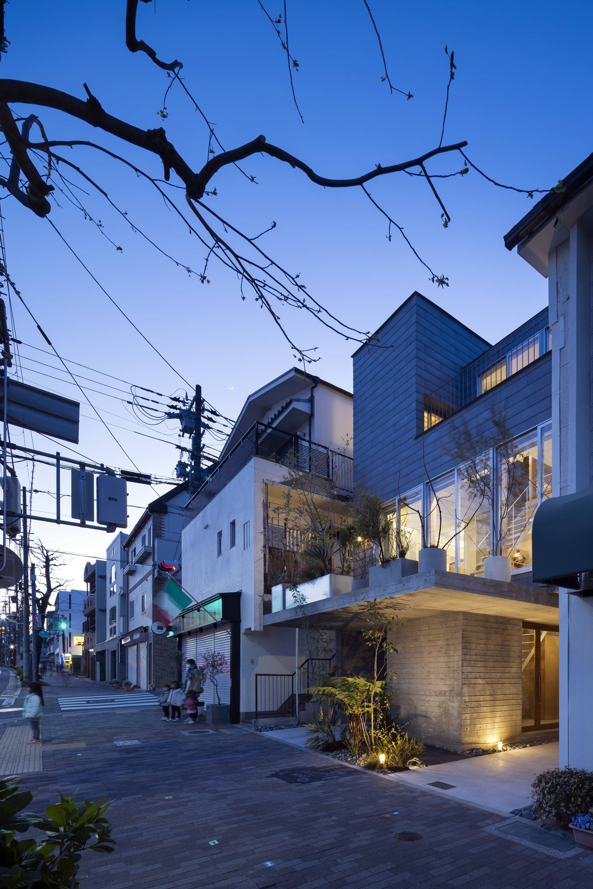具体的にはまず、ボリュームを歩道いっぱいまで建築するのではなく、軒先のみを隣地と揃えながら、セットバックさせた。1階RC造、2、3階木造の混構造3階建てとし、1階はボリュームを敷地中央に凝縮させることで、全体の浮遊感を演出し、上部もボリューム操作により圧迫感を軽減させた。軒は奥行2,275mmのキャンチレバーとし、見付は215mmに抑え、軽やかな表現としている。さらに軒上と軒下には植栽スペースを設け、立体的な庭とすることで、街の中にぽっかりとした「余白」を生み出し、喧騒を受け止めるような懐の深い設えとした。
