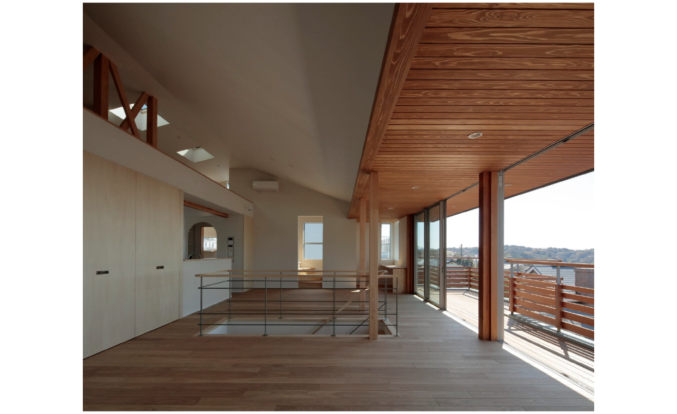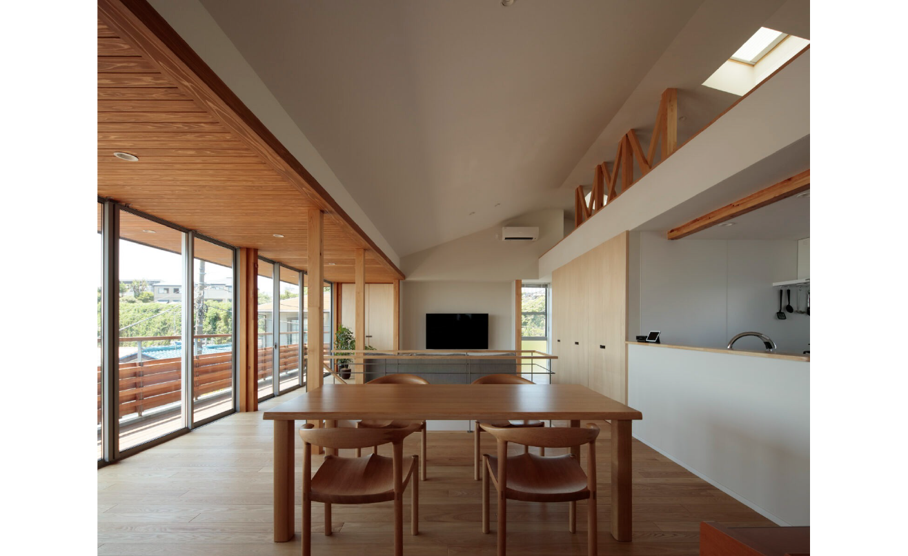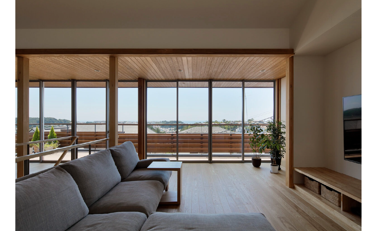 もともと2段擁壁のあった、海を望める敷地です。2段擁壁を解体し、一部は構造上安全な擁壁を構築し、その他の部分は、もともとあった斜面を復元しました。そこへ海への眺めを最大限確保できるように2階にリビングを計画しました。1階から2階へのスケルトン階段の隙間からも海が垣間見れ、2階に上がると一気に展望が開けます。海を望む窓は、あえて高さを抑え、より水平方向への拡がりを感じられるような仕掛けとなっています。さらにホワイトアッシュフローリングと珪藻土壁、杉板張りが空間に温もりを与えています。