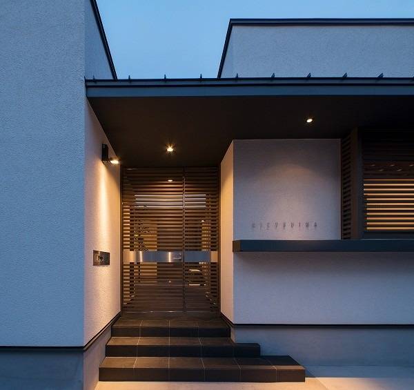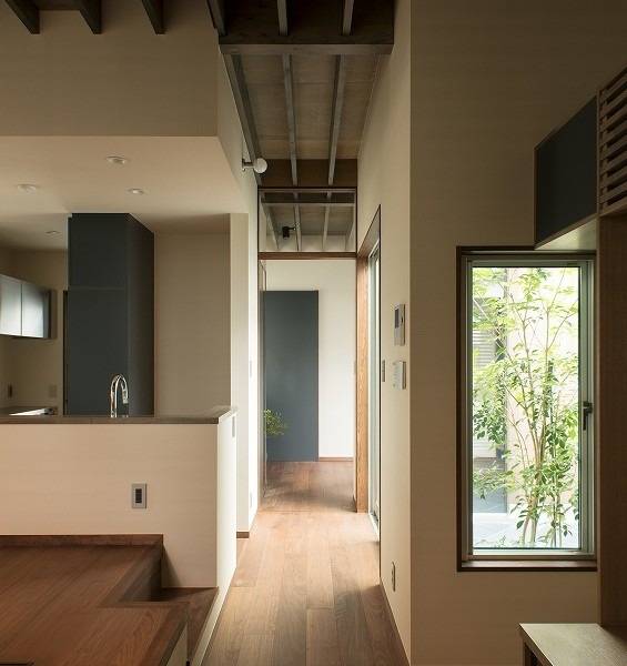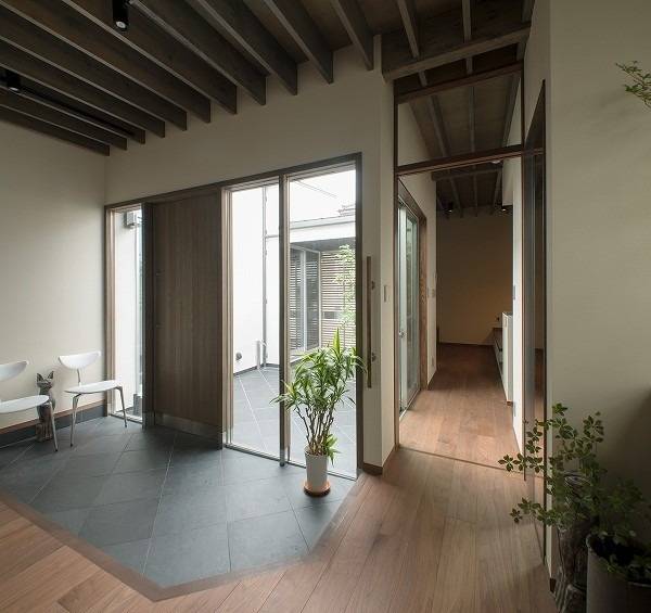 門扉から中庭を介し奥まった位置に玄関を置くことにより、各部屋の中庭への開放性と回遊性のある動線を実現しています。2階建ての場合必要になる階段のスペースを家全体に割り振り、平屋特有の高さの自由度も有効に使いながら、少しずつゆとりのある空間作りを意識しました。また、玄関ホールにも床暖房を入れるなど、室温の均一化にも配慮しています。
