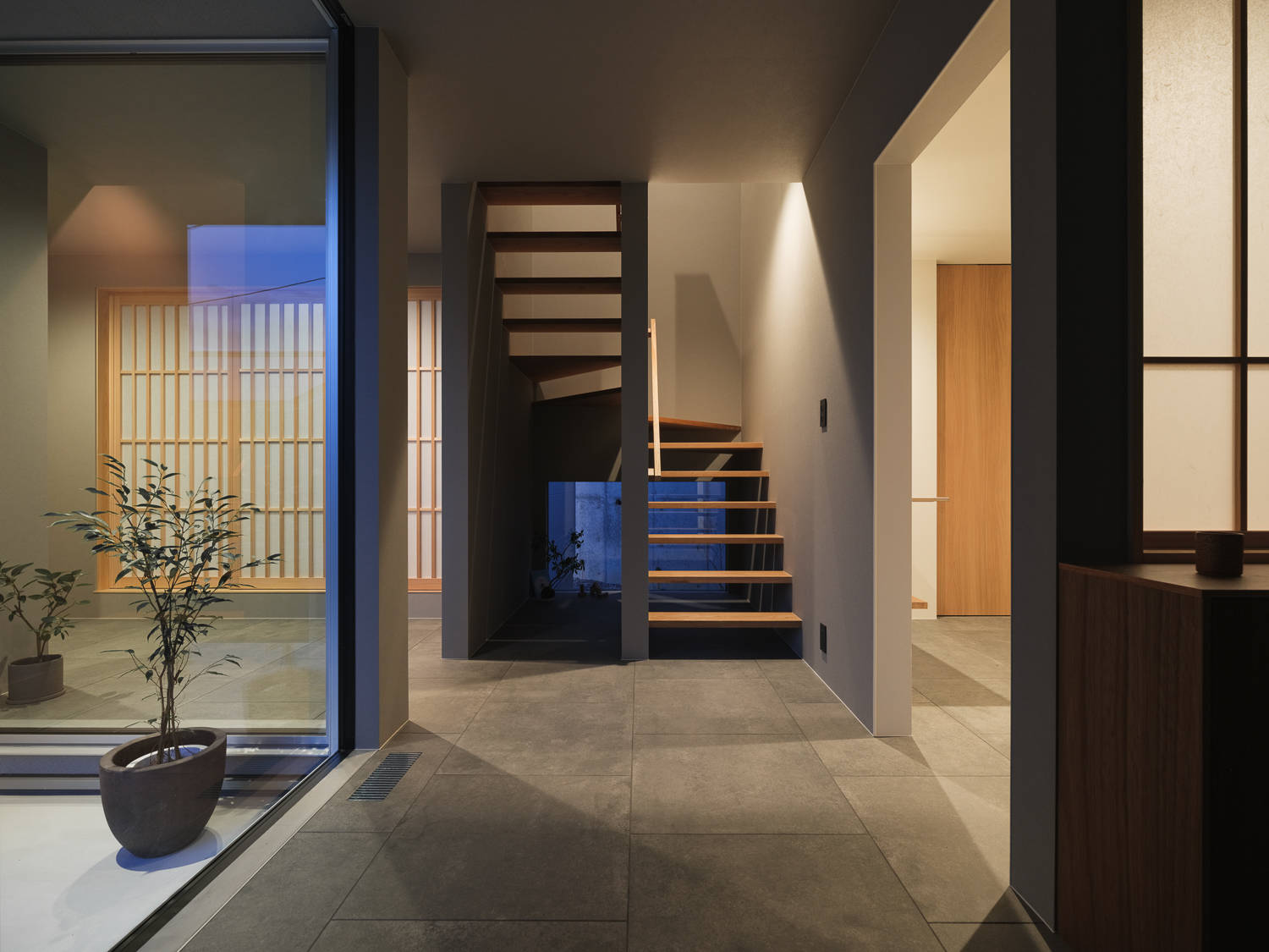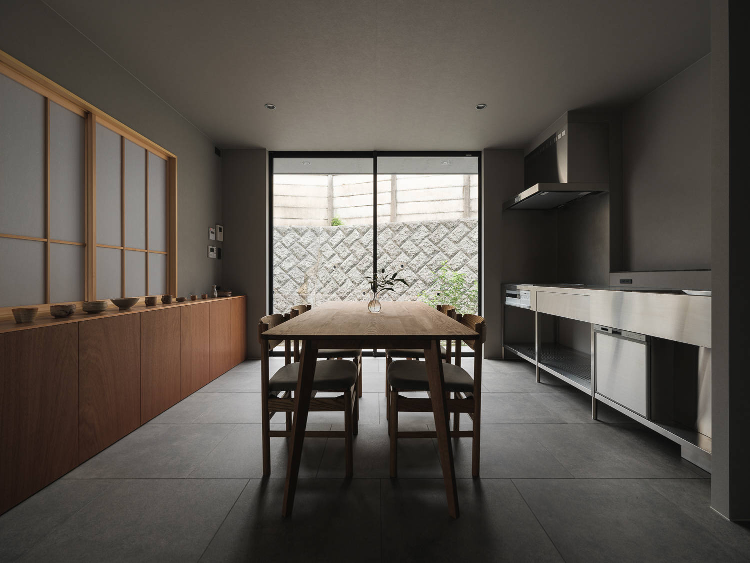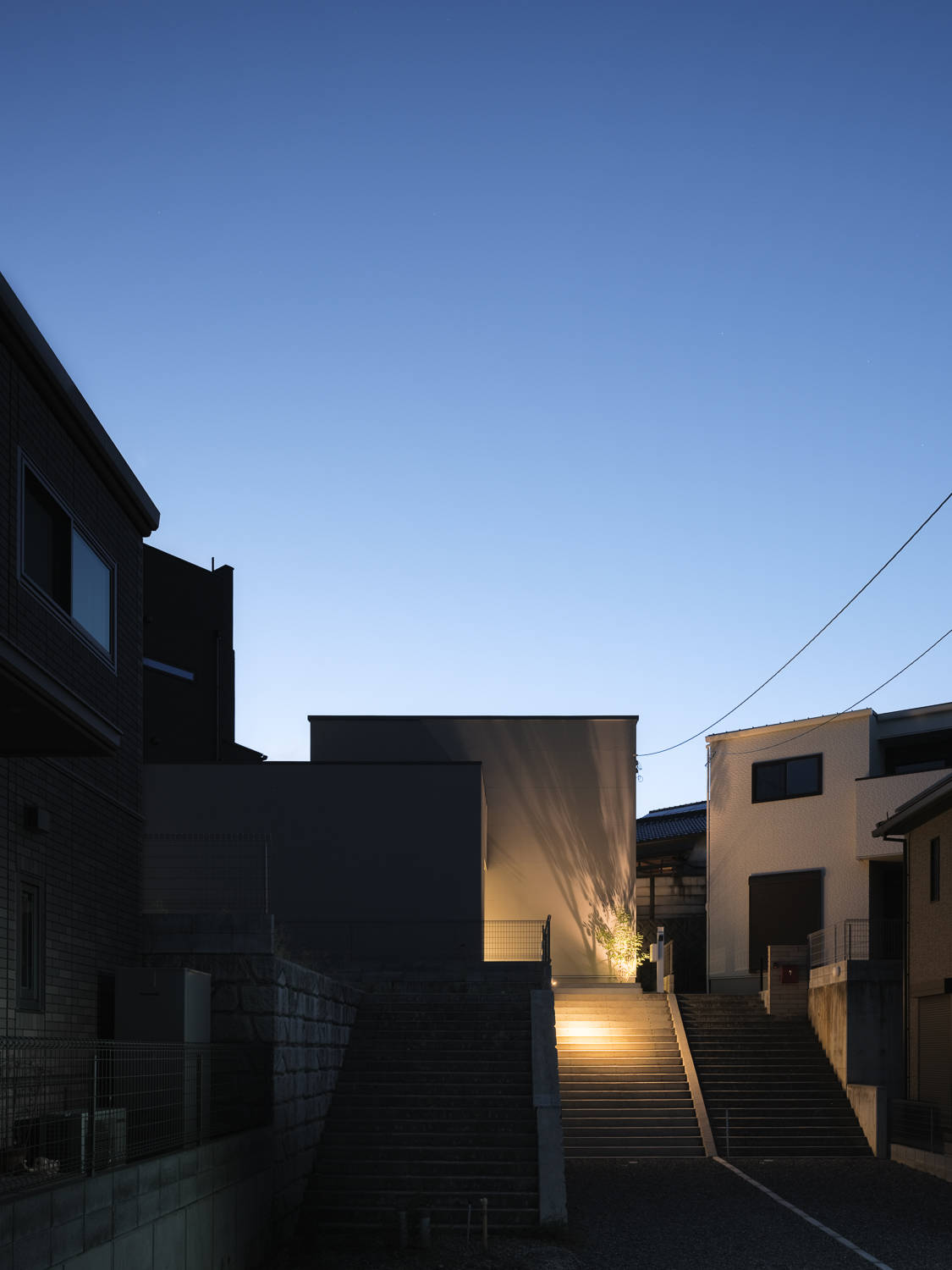 擁壁に寄り添い、ファサードには開口部を設けないことで、閉ざされた敷地でありながら、周辺環境と接続した。