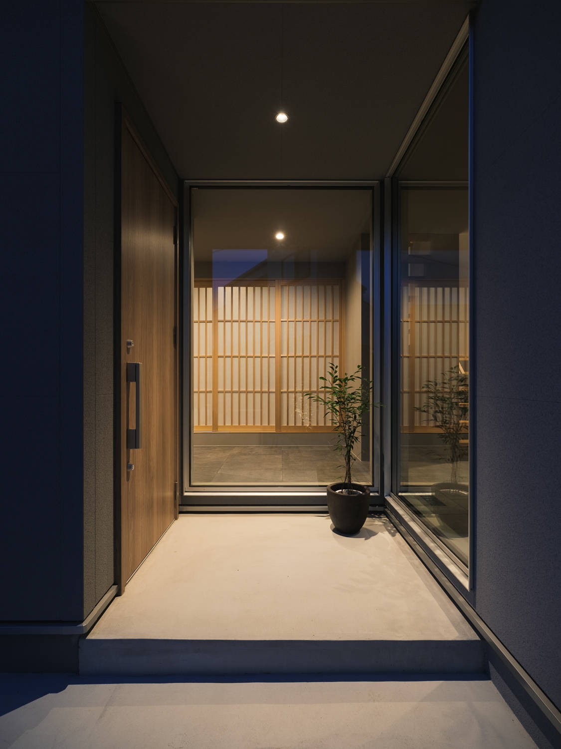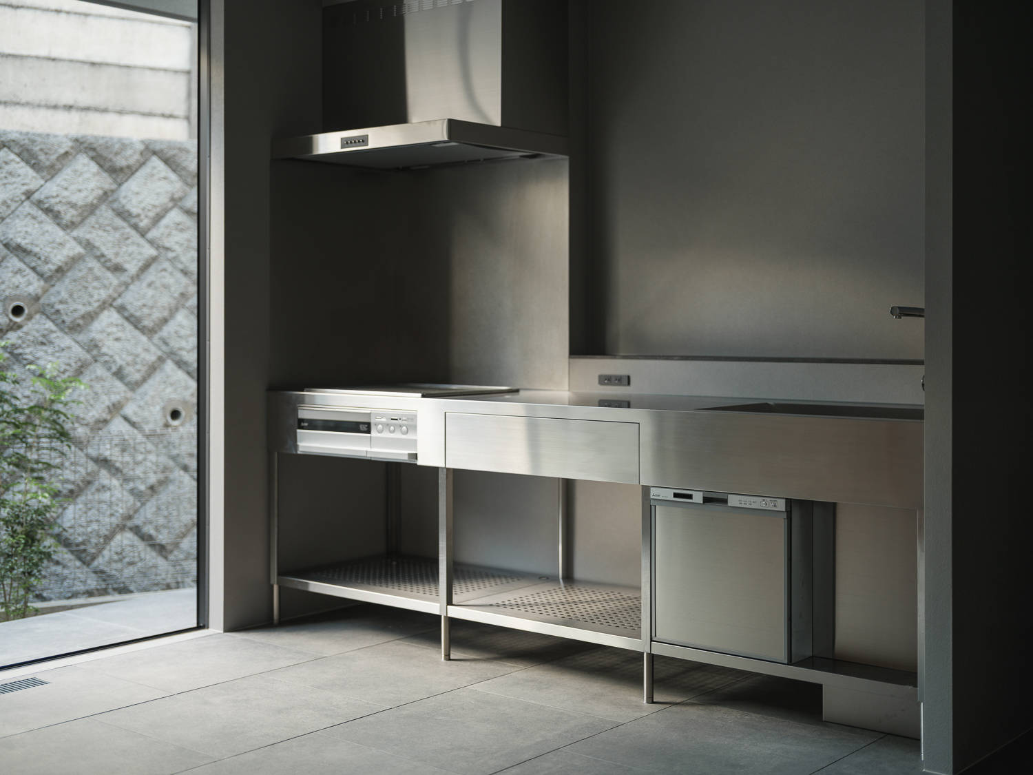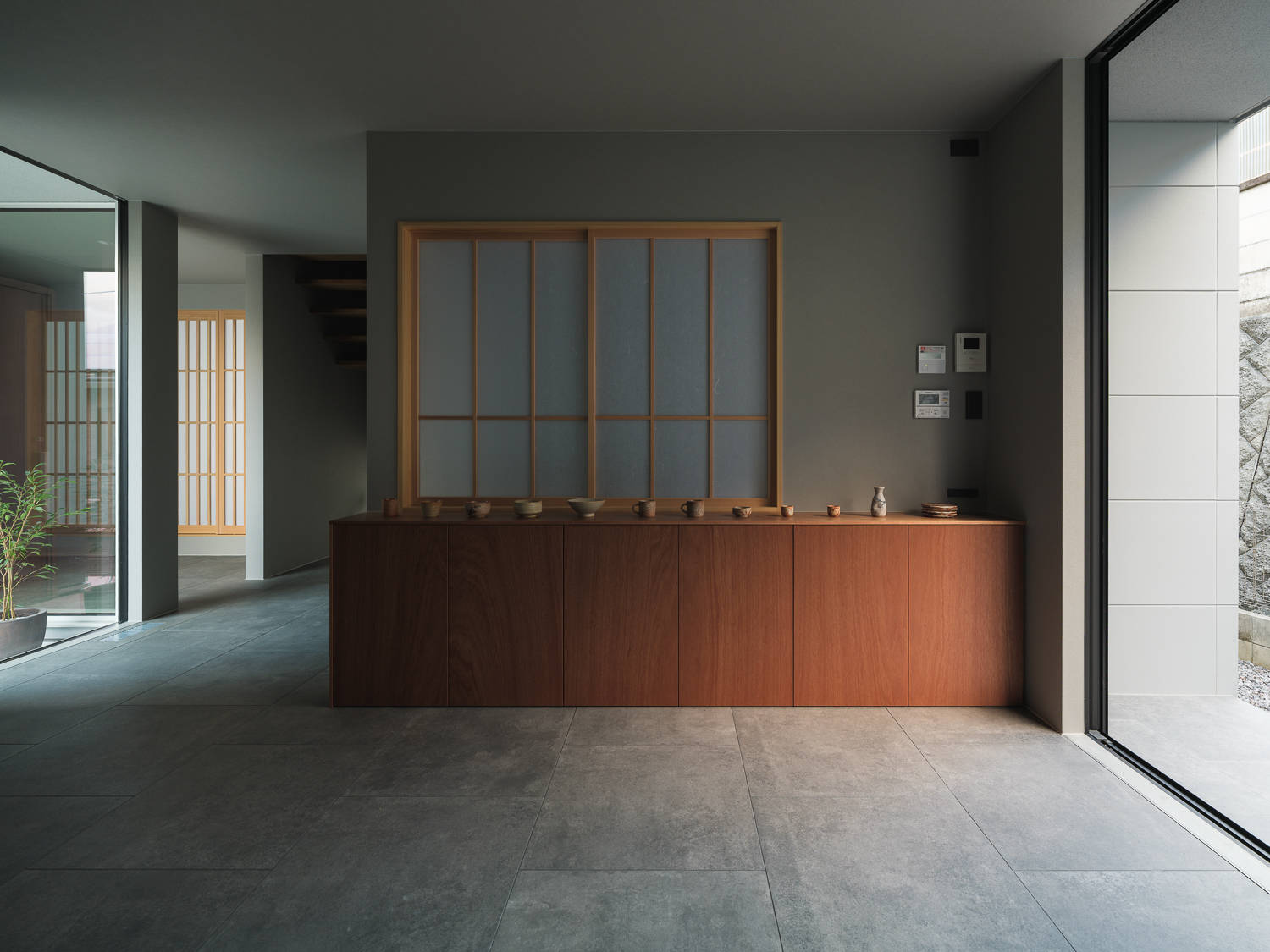擁壁に寄り添い、ファサードには開口部を設けないことで、閉ざされた敷地でありながら、周辺環境と接続した。