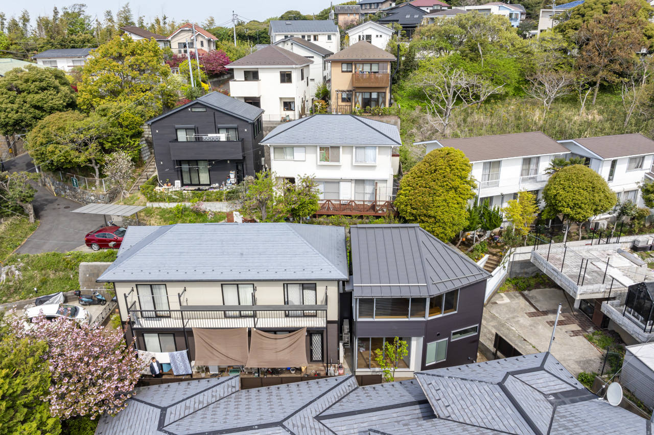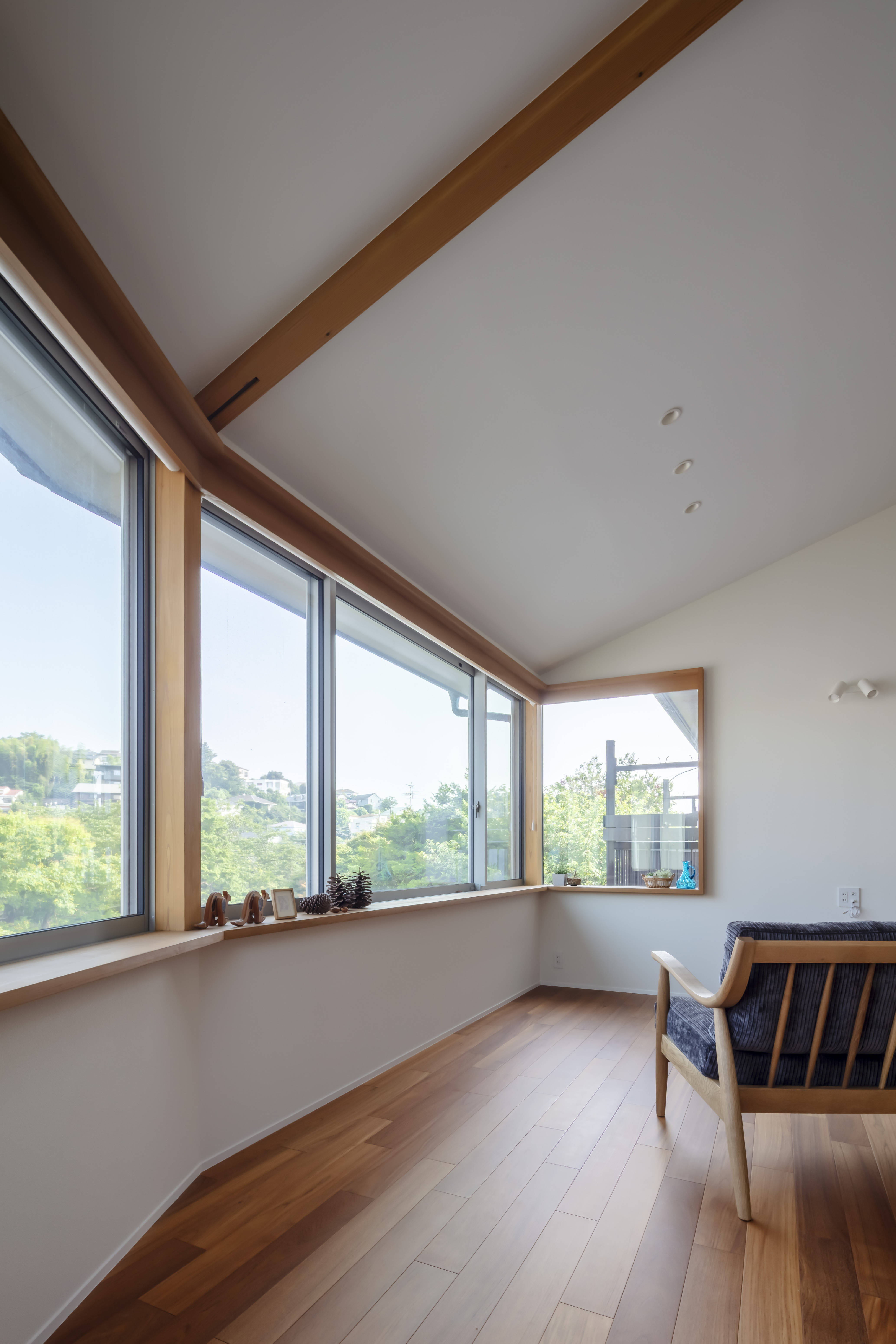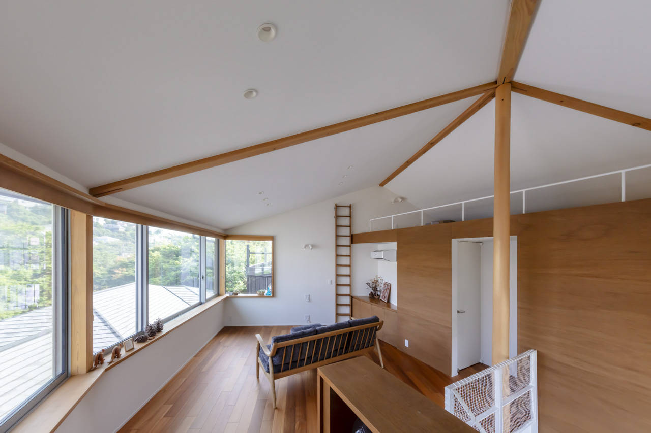 屋根架構に包まれた2階は南側隣地との高低差を生かした大開口を設け鎌倉山の緑景を取り込んでいます。一方で、不整形平面と変形屋根により生まれる余白を利用して書斎やロフトを配し、大らかな空間とニッチな空間を同居させています。
