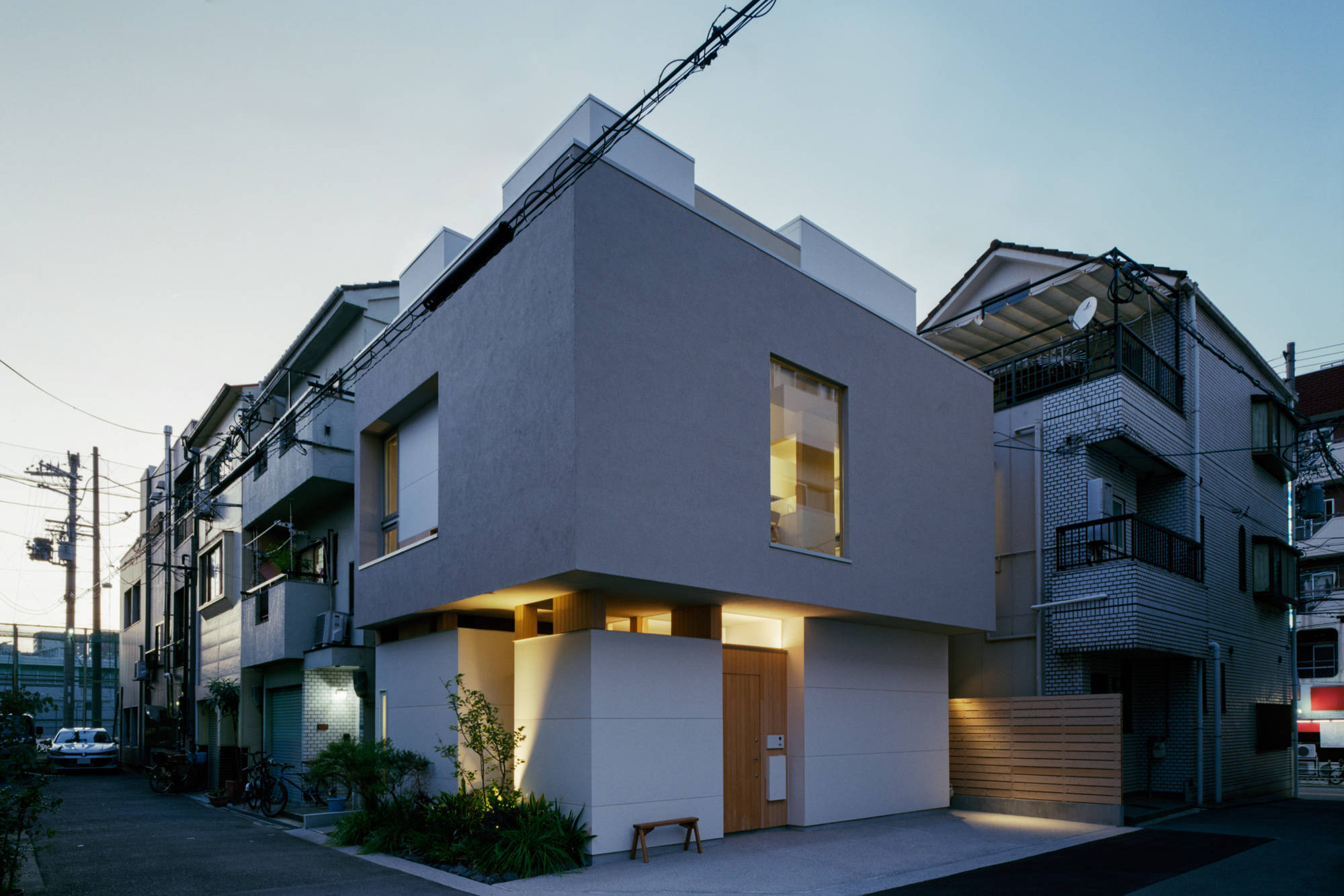 建物の高さを最大限に活かすため、道路斜線制限に対しては天空率を検討し、都市のスカイラインに貢献するようなデザインを目指しました。また、2階のボリュームは軒下から天井まで壁と同じ仕上げにすることで、まるで空中に浮いているかのような軽快な印象を与え、見る人に驚きを与える面白い外観を実現しています。