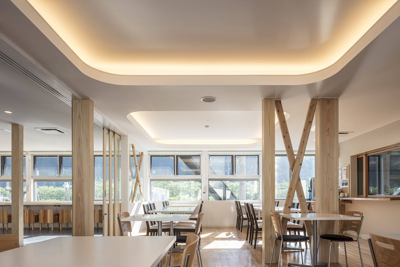 1階は1/3を地元のお土産を中心としたショップに、1/3は待合と交流スペース、残り1/3はギャラリーとこの地域でも人気の洋食レストランを計画した。客席から内陸線が見え、トレインビューカウンターを用意した。ここは地域の数少ない外食ができる場にもなっている。