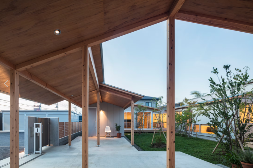 都市的な要素のこの場所で世代を超えて住み継ぐ家として、二戸の住宅と、街に面した開放的なピロティで庭を囲う「開かれた中庭」を持つ平屋の住宅を考えた。