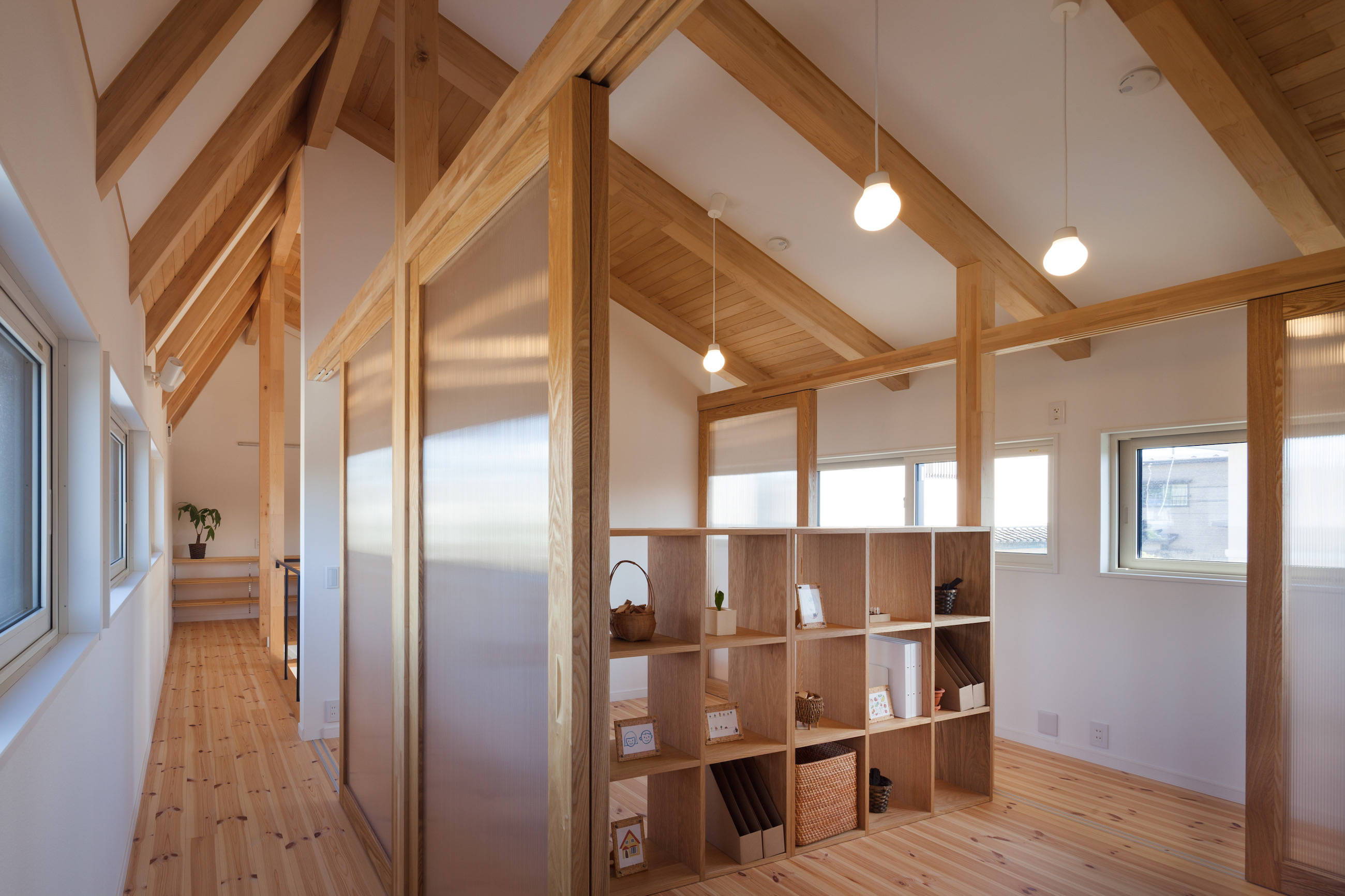 東西方向に長方形の箱型のプランに南と北に廊下状のスペースを設け、季節によって建具で大きく開閉したり、コンパクトに閉じたり、昔の日本のどこでもみられた様に季節の変化を生活の仕方を変えることで対応しようというものです。