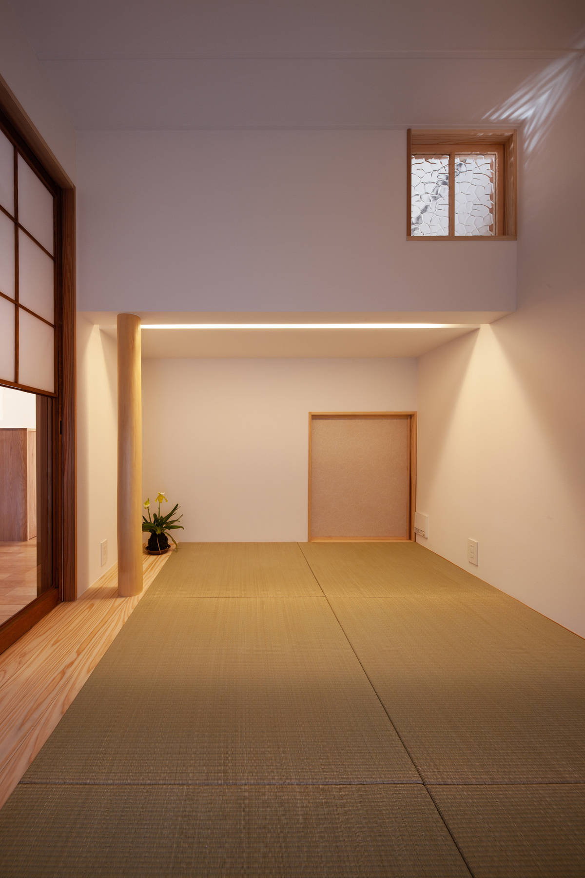 ご両親から引き継いだ庭(樹齢60年以上の梅等)と中庭デッキを地域に開く。生まれ育った家で使われていた建具も利用し、暮らしも引き継ぎながら、人が気軽に集える暖かな家。