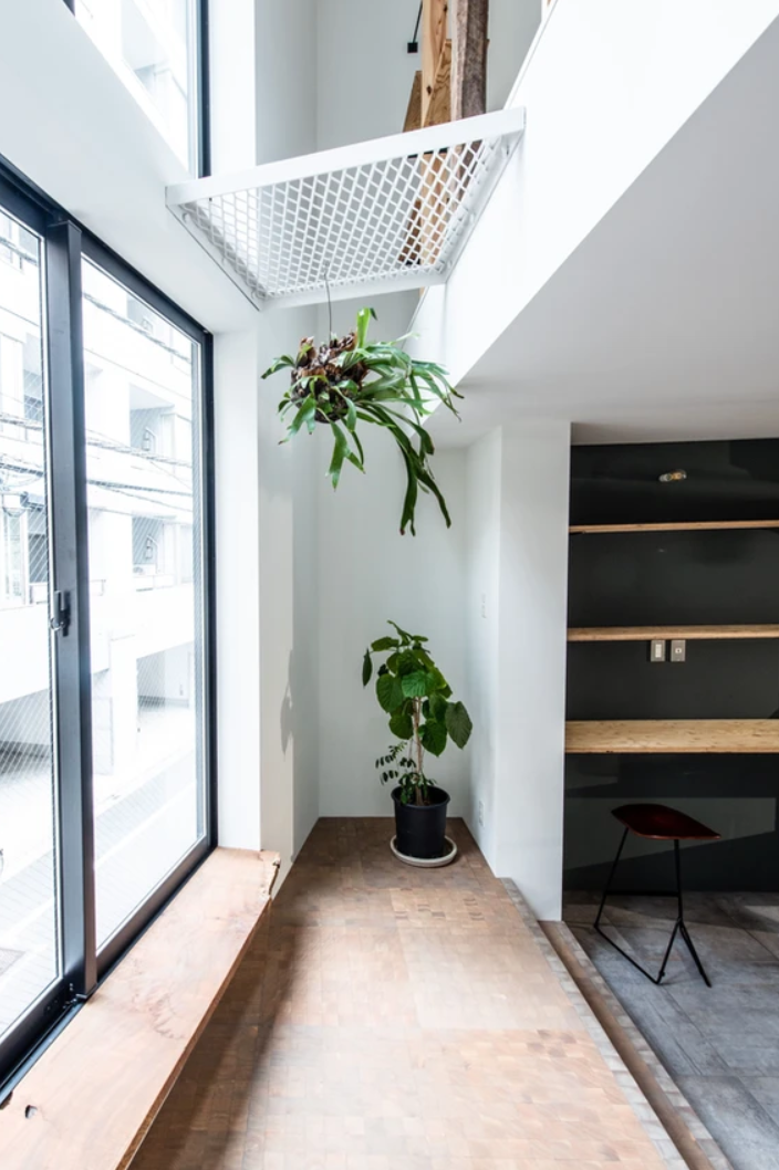 三方に建物が迫っているので、接道側に大きな窓と天窓からの光が降り注ぐ、吹き抜けサンルームのような小上がりを設けています。