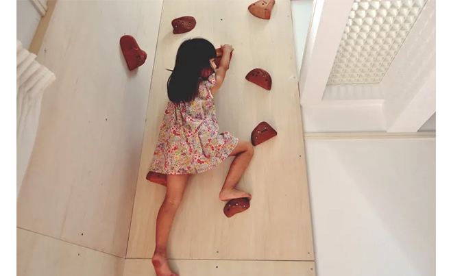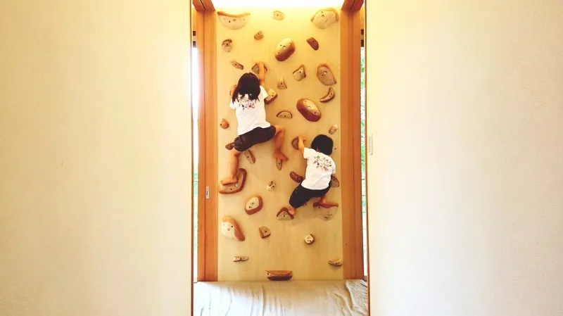 『月見山の家』で施主の方と相談の上、ボルダリングができる箇所を設けることに決めた際に、家になじむ素材のパーツはあるだろうか、と思い探しました。ボルダリングのパーツはカラフルなものが多いですが壁にもラワン材を使用し、木の質感が活きたこの家では少し浮いてしまいます。違和感のない木製の物を調べてVOCKさんにたどり着きました。空間にきれいに溶け込み、実際に施主のご家族が暮らし始めてからの耐久性も問題なくおすすめです。