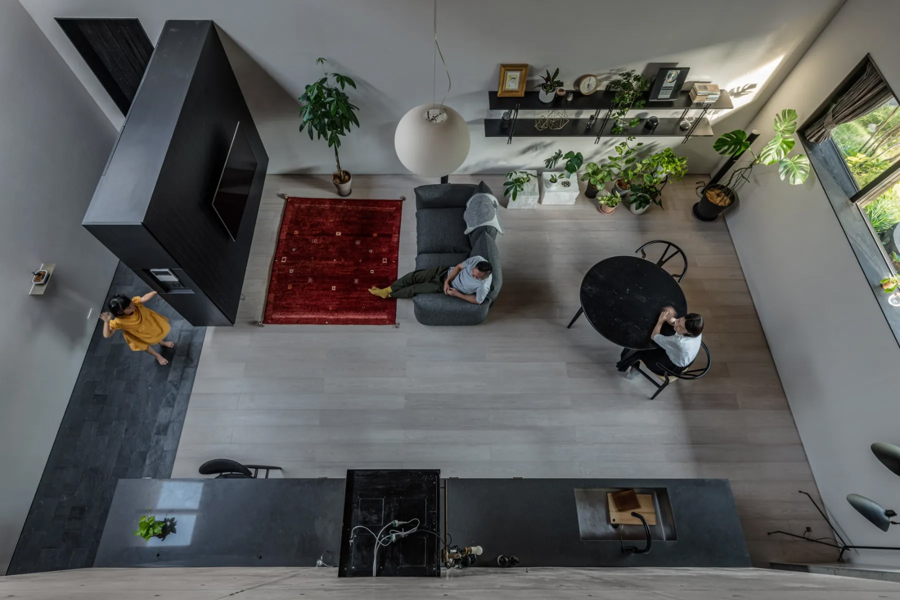 どこでも家族の気配が感じられるように、ワンルームのように広がる内観。2つある個室には扉を設けず、LDKから水回りと個室をスキップフロアで繋げて、空間を緩やかに区切っています。
