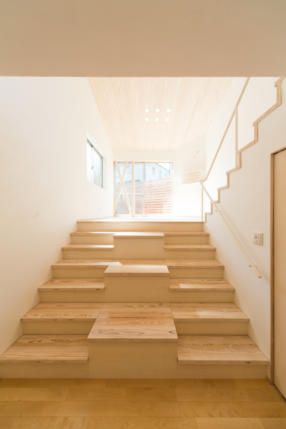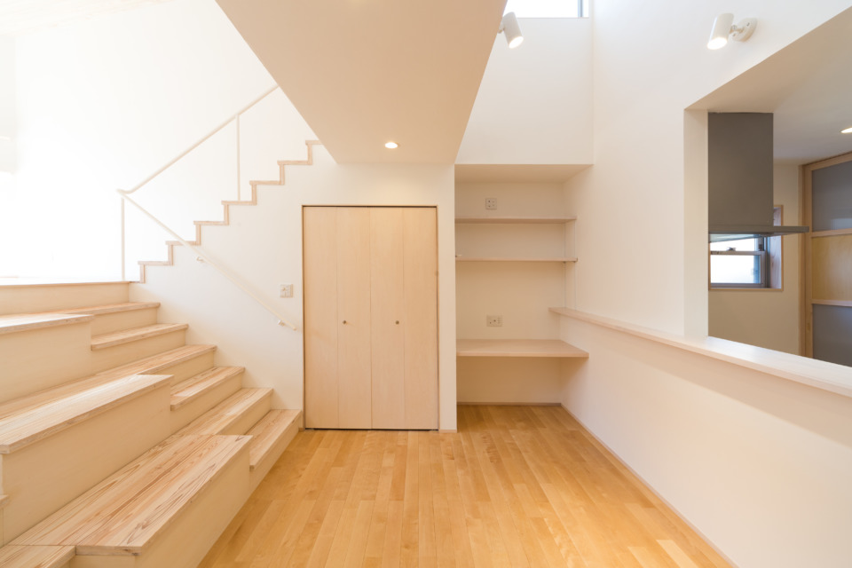 1階をリビングにするために段差をフラットにしようとすると、外から室内を見下ろすかたちで丸見えの状態になるため、土地の段差を活かした収納階段を設置しました。下から上まで、全てが収納になっています。