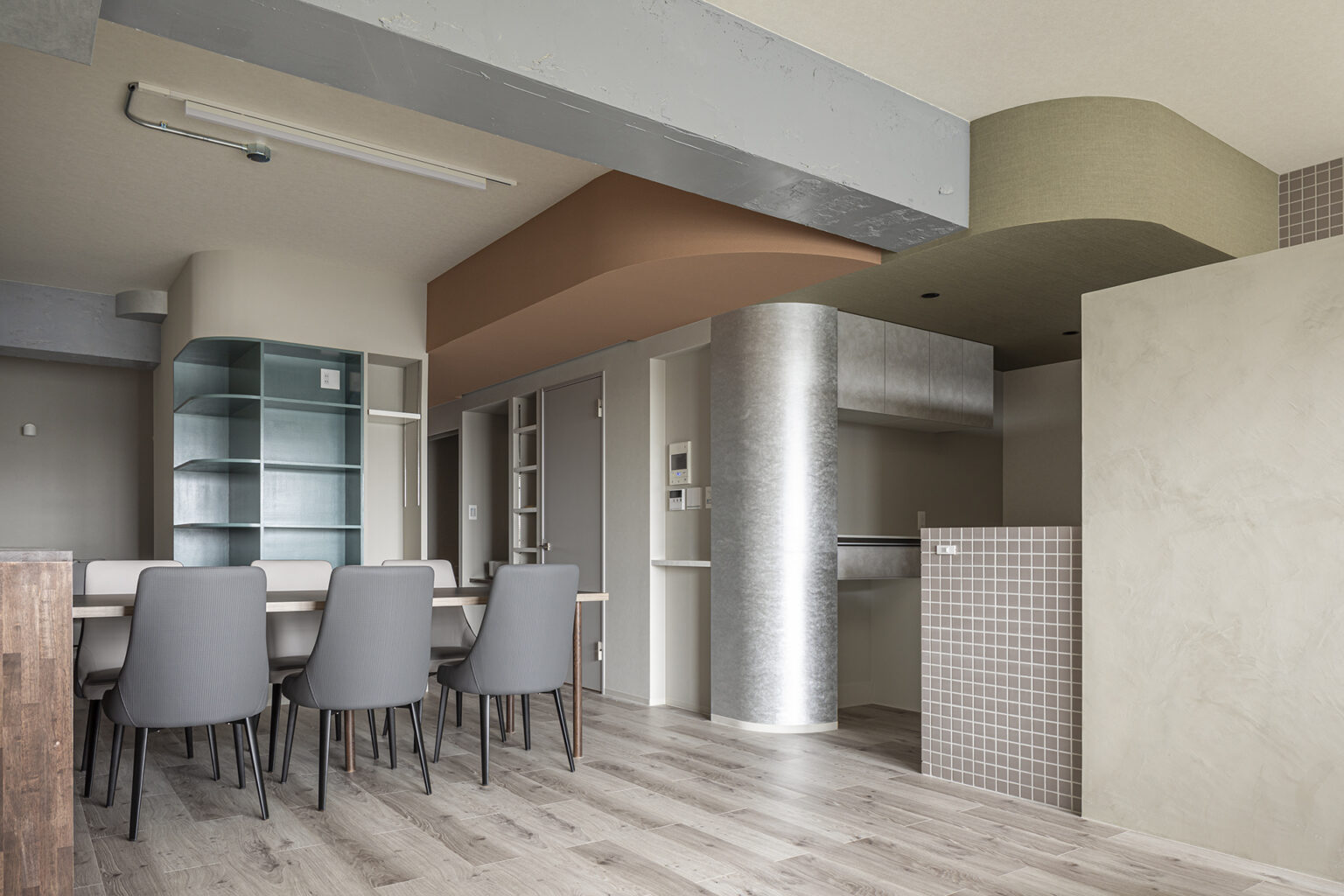 内部では、天井のデザインに工夫を凝らしています。キッチンの天井はアクセントの壁に合わせて板張りを採用し、コージーで包まれるような落ち着いた雰囲気に。一方で、ダイニングやリビングは吹抜けや化粧梁で空間にリズムを与えることでLDK全体がメリハリの効いた空間構成となっています。