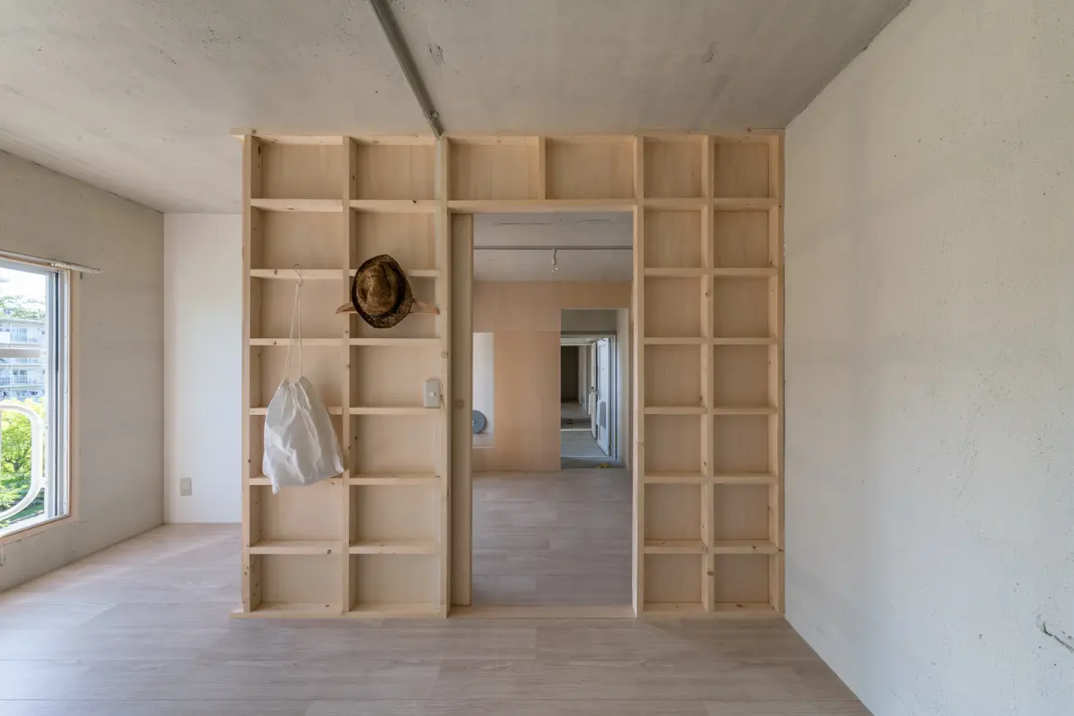 今回のリノベーションでは、単に部屋を作るのではなく、多機能を兼ね備えた壁を住まいの中心にロの字型に配置することで、既存の団地の間取りに囚われない、新しい空間となりました。