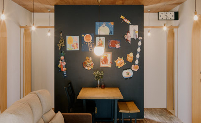 メインのダイニングテーブルに接する大きな黒板は、マグネットボードを用いて造作した。小さな子どもたちが触っても大丈夫なように、自然素材で優しい塗料を選んで塗ったというその壁は、きっと時間とともに絵や写真、あるいは家族同士の伝言板のように呼応するだろう。
