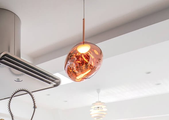こちらの住まいでは、階段横の奥まった場所にキッチンがあるという条件を逆手に取り、特別感のある空間に仕上げました。