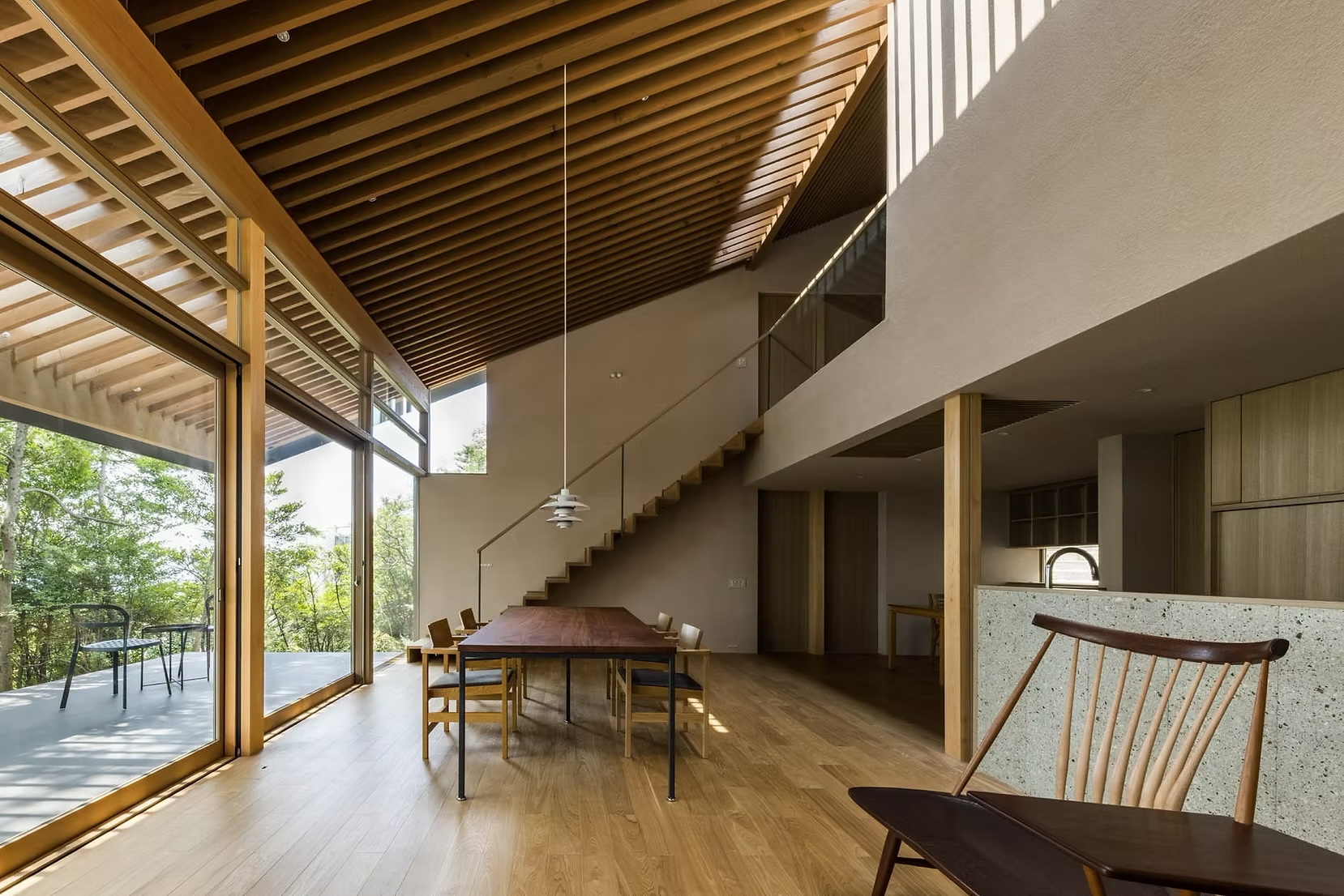 森に面したLDKは、全面ガラスの開口によって緑の風景を室内へと引き込み、まるで林の中で暮らすような感覚をもたらします。LDKの外には、勾配屋根がそのままテラスへと連なり、軒下のような半屋外空間が雨の日にも自然を身近に感じられる場となっています。キッチンの奥には作業スペースも確保され、日常の動きが自然と調和するように設計されました。