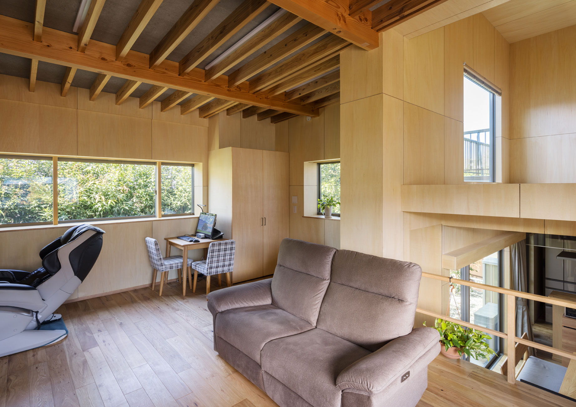 さらに開口では、住宅密集地で大きな窓を設けることは難しかったものの、隣家の緑を借景として取り込むなど、視線が抜けるポイントや緑が見える場所を整理し、開口部を効果的に配置したことで、開放感のある空間となりました。