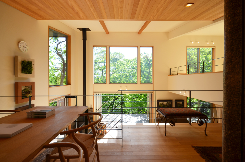 約30度の急傾斜を逆手に、自然を取り込む設計とし、「傾斜を魅力に変え、自然と共生する住まい」という想いから生まれた建築です。