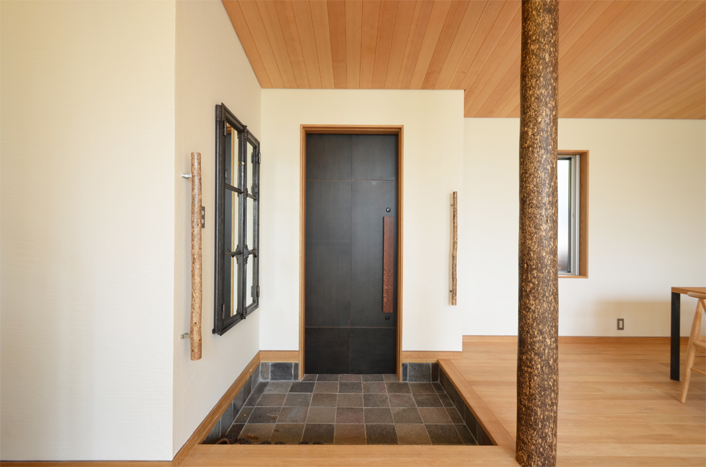 玄関扉には、「黒錆のコールテン鋼」を貼り、床には南佐久で採れる赤や黄の独特な錆色の「佐久鉄平石」を張り、どちらも経年美で味わいの増す素材を採用しています。柱には、檜の丸太を山に放置して天然の黒カビをまとわせた「錆丸太」を採用。これは茶室などの数寄屋建築で用いられる素材で、和の趣と天然の力強さを感じます。