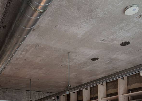 壁と天井には、高断熱のネオマフォームという断熱材を施工。外壁から約90センチの範囲まで巻き込むように張ることで、外から伝わるコンクリート熱を抑えます。さらに、一階の住戸ということも踏まえて、床全面にも断熱材を敷き詰め、水を温めて床下を温かくする蓄熱層を採用。従来の床暖房とは異なり、30℃前後の低温の温水を循環させるため、低温やけどの心配もなく、高齢者にも安心です。