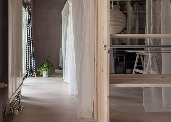 フレキシブルな空間にするため、壁を取り払ったワンルーム空間とし、間仕切りの代わりに、簡単に移動・調整可能な棚やカーテンでゆるやかに空間を仕切る設計としました。