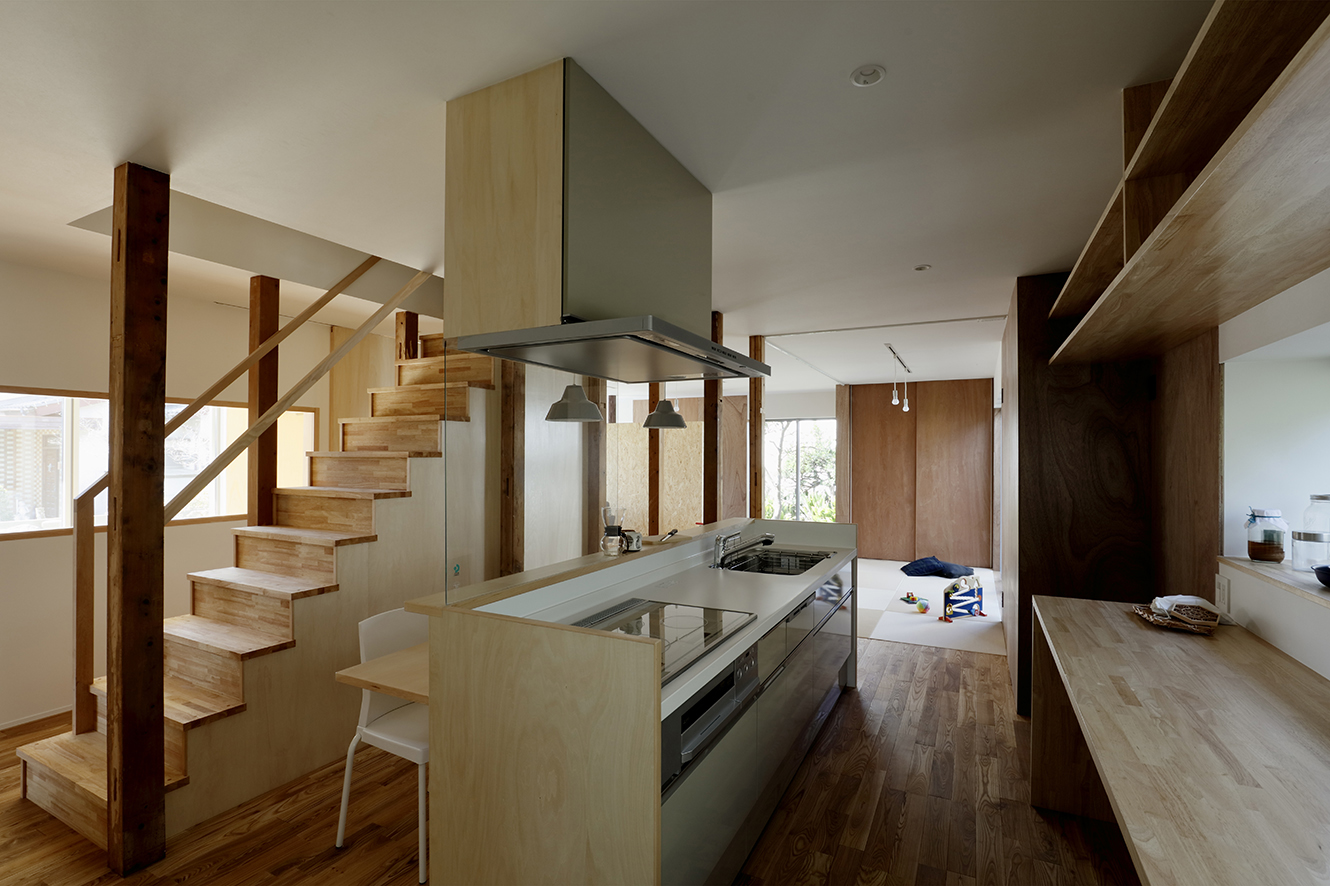 襖で仕切られていた畳の間の壁を取り払い、残った柱を活かしたワンルームに近いLDKへと更新しました。住まいの中央にある階段まわりの壁もなくしたことで、南側の寝室から取り込んだ光が、暗くなりがちな階段まわりや北側のキッチンまで明るさを届けます。