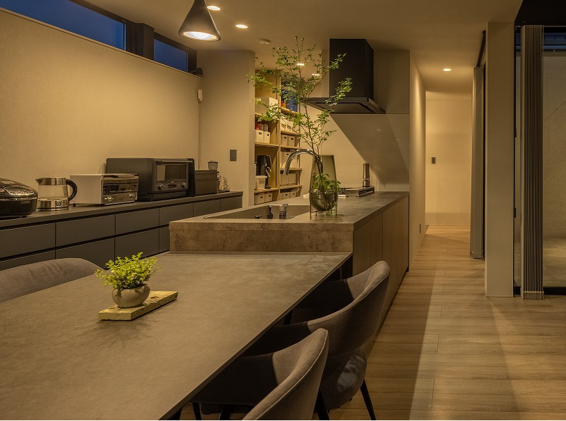空間は、デザイン性と美しさを重視した「グレーで統一したい」という施主の明確な希望を軸に構成。照明計画には明暗のコントラストが効いており、明るく広がるLDKに対し、寝室や水まわりはあえて光を抑えることで、静けさとの対比を生み出しています。