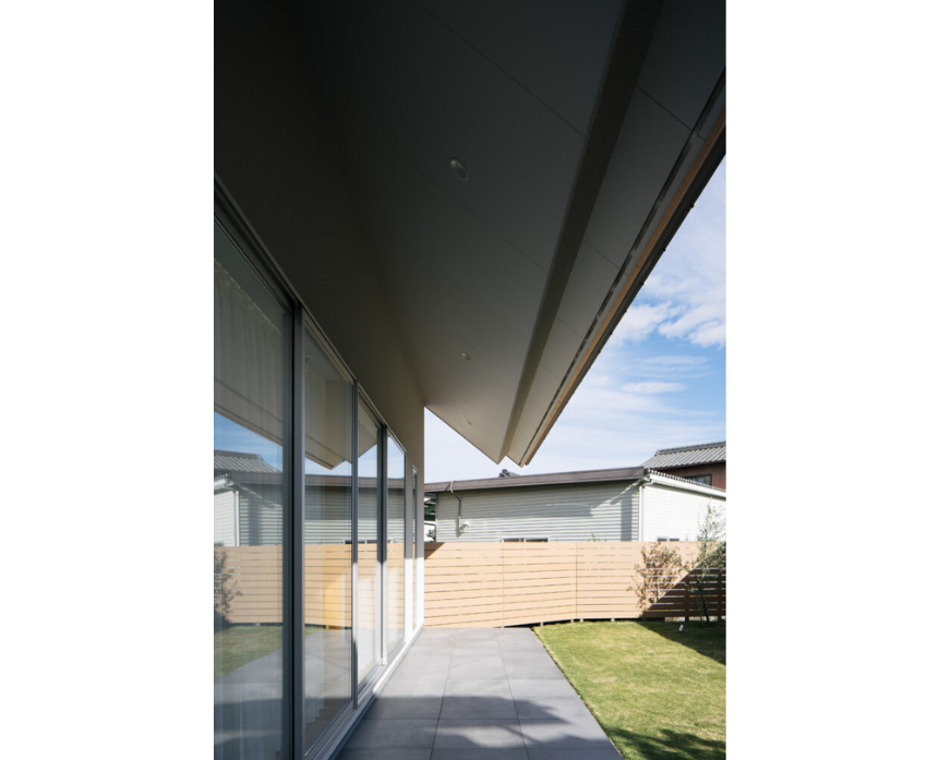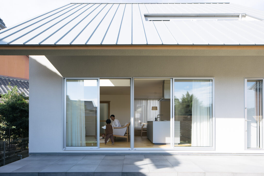 この大屋根は、空へとつながり、光や風とが一体になるような軽やかな白で仕上げられています。大きな褒は夏の日差しを遮り、冬は室内に光を取り込むため、一年を通して快適に暮らせます。