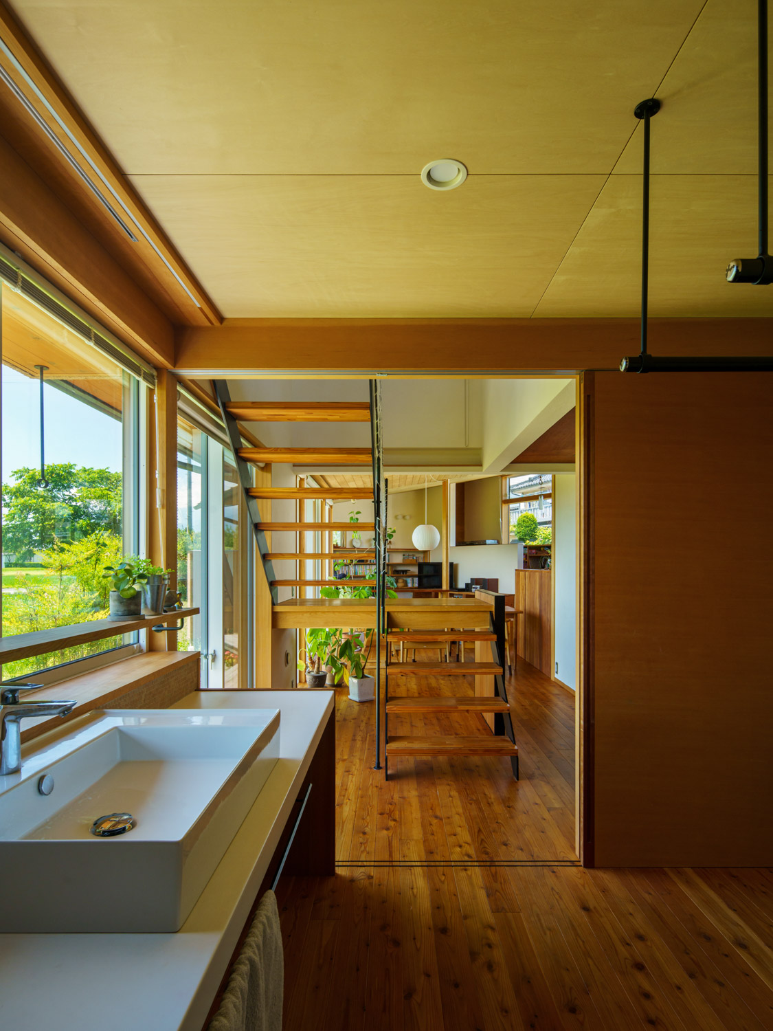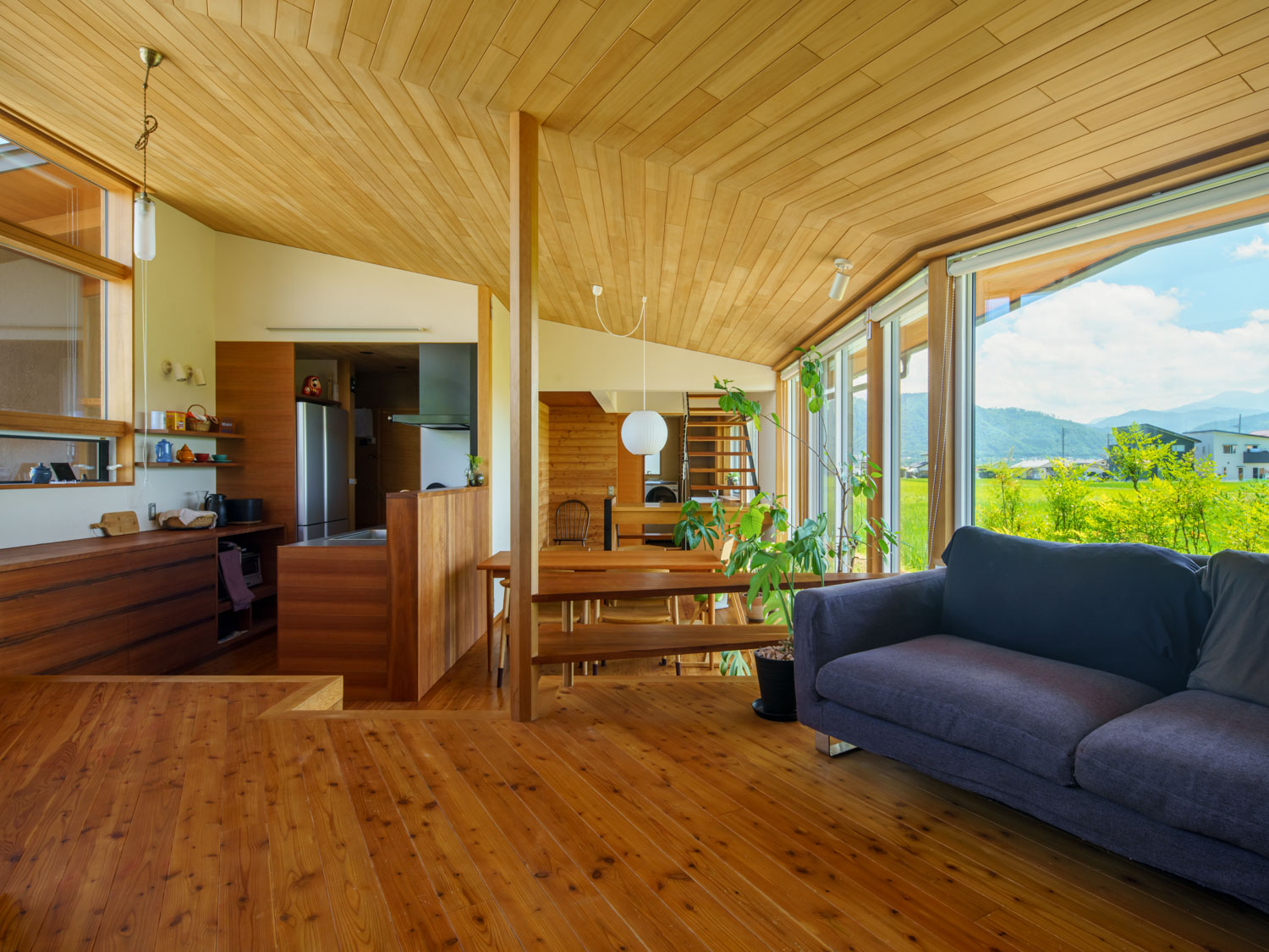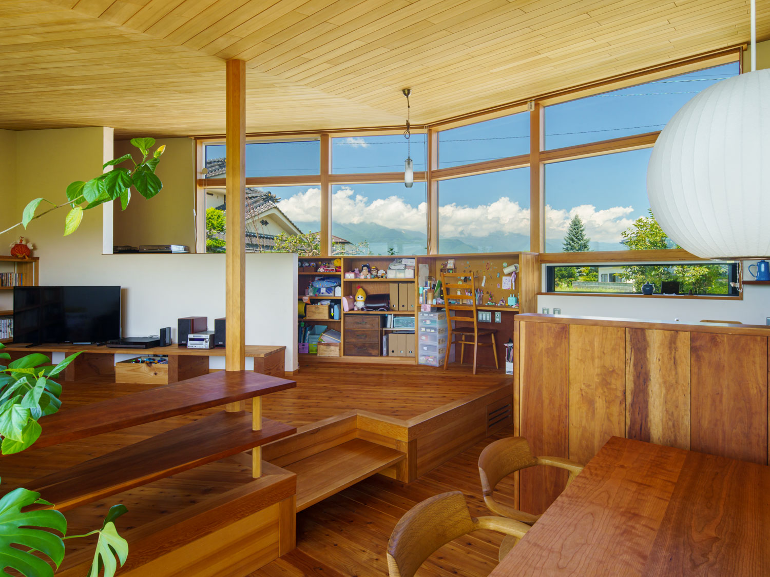 家族4人が暮らす1階は、LDKと水まわりを一体化した伸びやかな空間。折れ曲がり部分に設けられたリビングはスキップフロアで2段上がり、周囲からの視線を外しながら北アルプスの山並みを望むことができます。窓一面に広がる朝焼けや夕焼け。日常に取り込まれる自然の表情です。