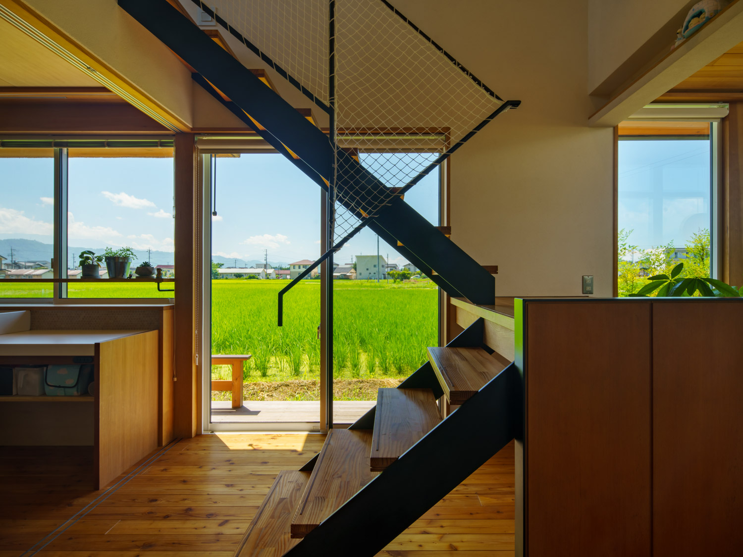 長野県南穂高の田園地帯に建つこの家は、ご両親の敷地に沿うように実現した住まいです。敷地は「への字」に折れ曲がった変形地で、景観条例により隣家や道路から一定の距離を保つ必要がありました。その結果、建築可能な範囲は限られ、土地の形状に導かれるようなプランに。