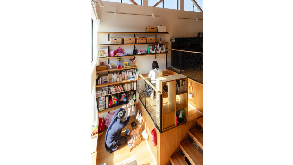 大きく設けた階段は、移動のための動線だけでなく、居場所や遊び場としても機能します。階段からつながる壇上スペースは、子どもたちが小さい頃は書斎として。子どもたちが成長した今では、ランドセルやおもちゃを並べ、自分たちでカスタマイズを楽しむ場所として。ライフスタイルに合わせて柔軟に変化します。