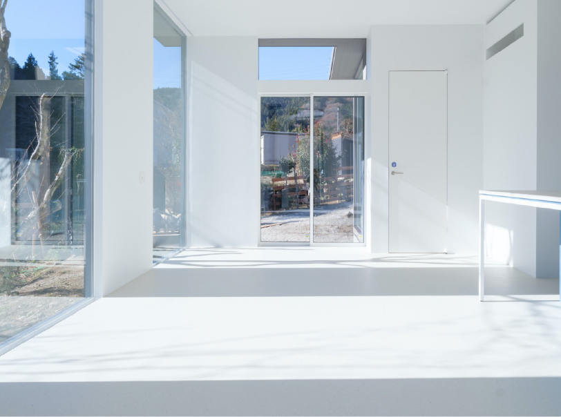 室内は壁と天井は白の塗装、床材には愛犬への考慮でベージュのリノリウムを使用。