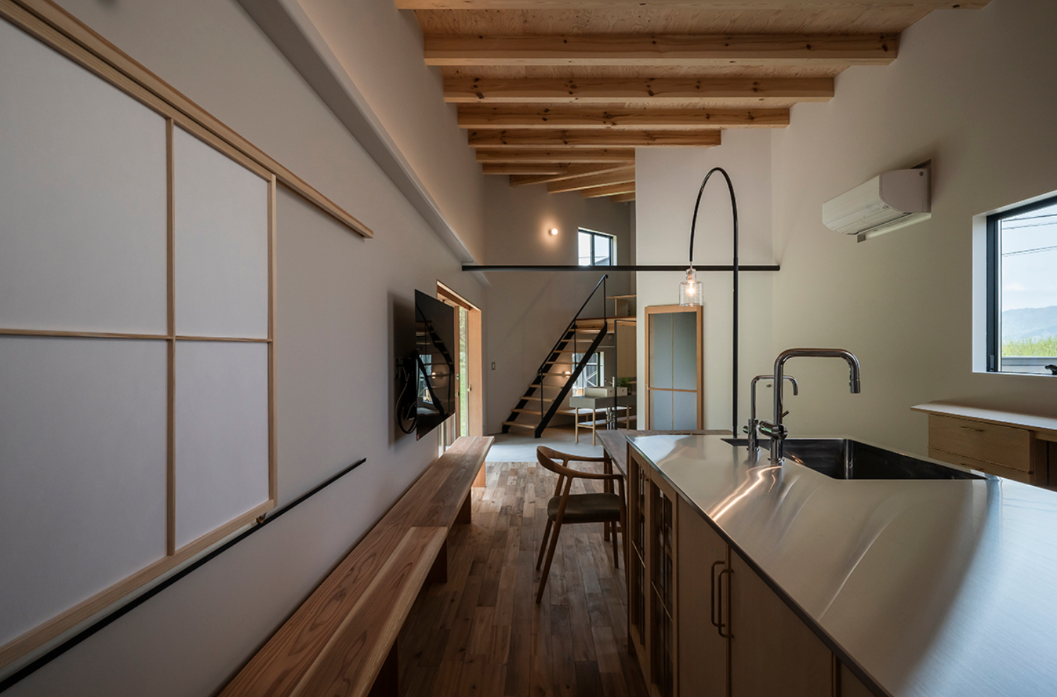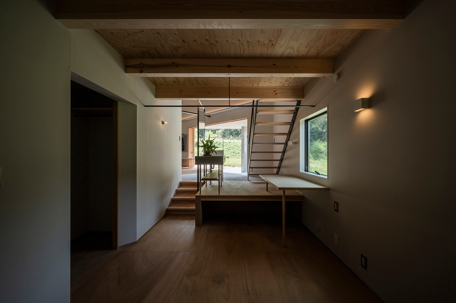 玄関土間を入ると、左右に寝室とLDKスペースが分かれます。リビングと寝室の間には段差を設け、その上に子ども部屋を配置することで、平屋のような要素と2階建ての要素を組み合わせた構成としました。