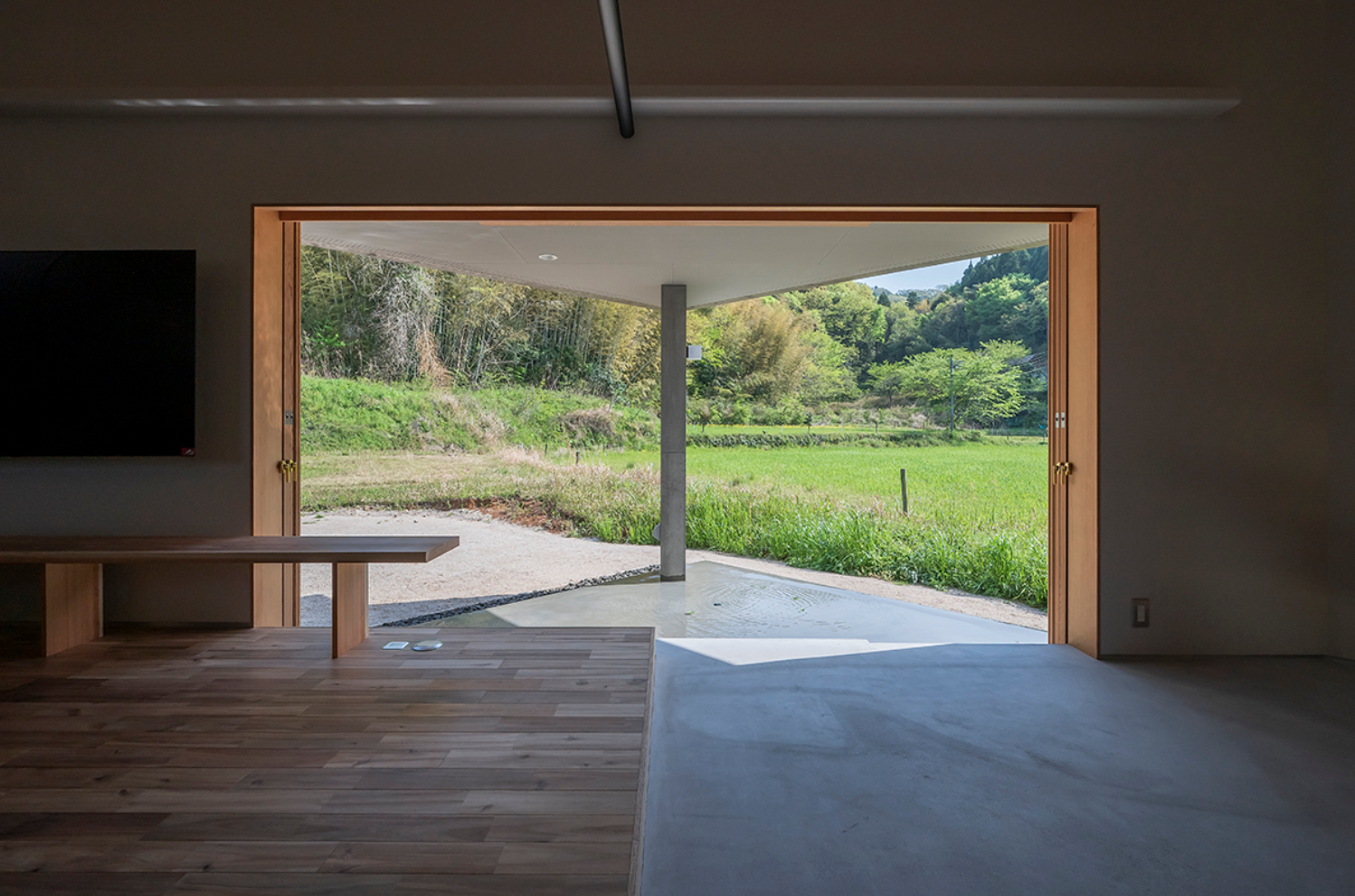 一段下がった寝室は小さな窓から光を絞り込み、洞窟のような落ち着いた雰囲気をつくります。一方で、一段上がったLDKには大きな開口を設け、開放感を。こだわりの木製の造作サッシは引き込み式にすることで外部に向かってフルオープンにできます。