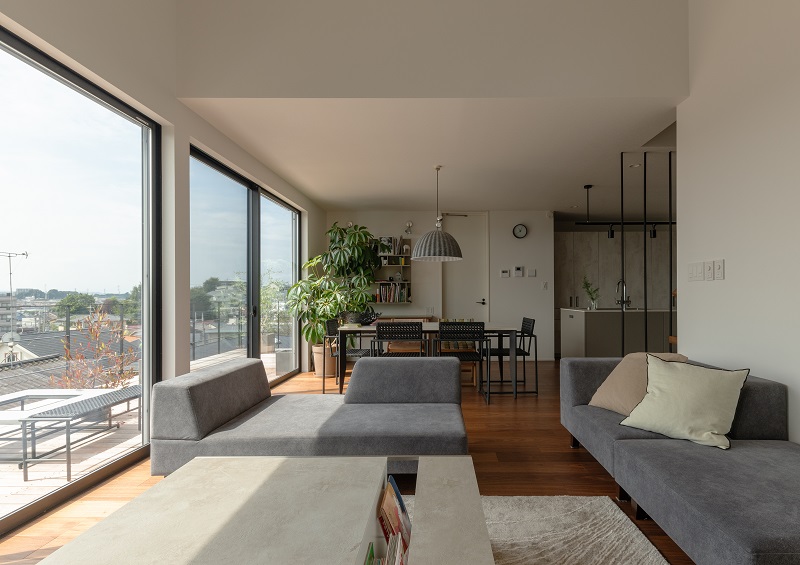 ピクチャーウィンドウや引き違い窓ではなく、すべて開放できるサッシを採用しました。浴槽は床に埋め込むタイプのものを採用。高台という立地上、外からの視線はほとんど気にならず、浴槽からは目の前に空が広がります。景色を独り占めする贅沢なひとときは、旅行先の宿で過ごしているかのような非日常を日常に取り込んでいます。