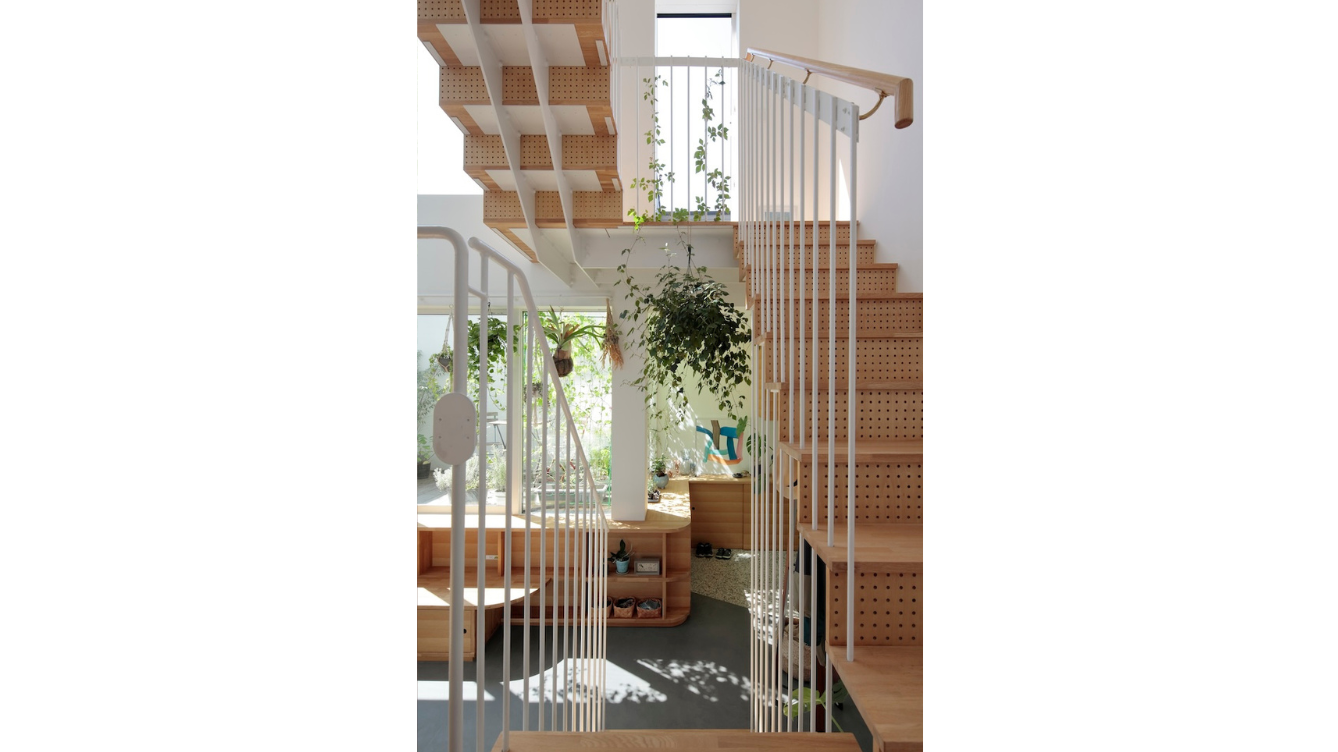 そこで、上から差し込む光を活かすとともに、玄関アプローチに余白を設けることで、外との程よい距離感をつくっています。玄関と道路の間に緩衝空間を設けたことで、空間的にも心理的にも余裕が生まれ、自然や光を意識できる場所になりました。