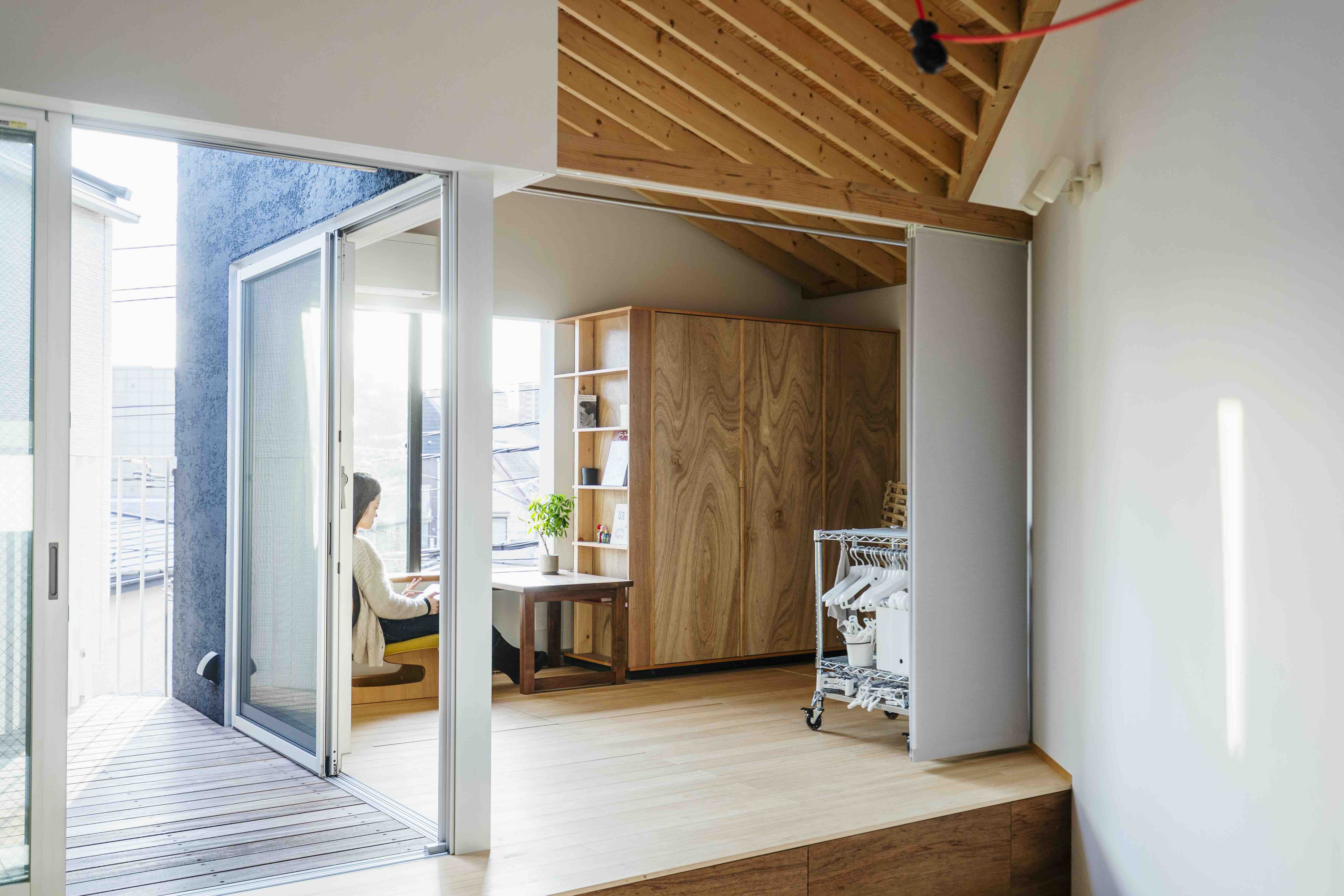 2階は仕切りをほとんど設けない大きなワンルーム。キッチンと食卓を中心に据え、家族が自然に顔を合わせる構成です。3階は天井高を3.5mに確保し、将来的に分割できるよう設計されています。