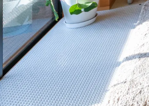 素材や色味など住まい全体の要素は抑えながらも、キッチンや洗面室には奥様がセレクトしたお気に入りのタイルをアクセントとして取り入れています。