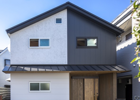 外観は白と黒を半分ずつに分け、その間にはグレーの杉板の塀を設けています。