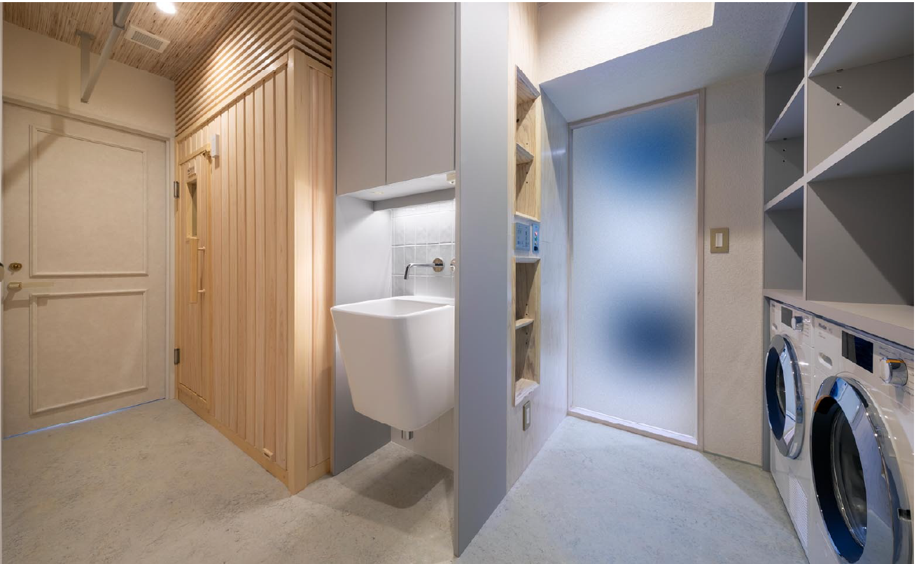 さらにプライベートなラウンジ空間には、お施主さんの希望のフィンランドサウナを設置。在宅時間の増加に合わせたリフレッシュ空間も実現しています。